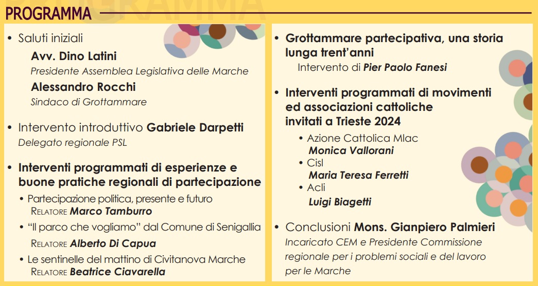 DIOCESI – Si svolgerà Sabato 6 Aprile, alle ore 9:30, presso la Sala del Consiglio Comunale di Grottammare, il convegno regionale dal titolo “Al cuore della democrazia: partecipare tra storia e futuro” organizzato dalla Conferenza Episcopale Marchigiana – Commissione Regionale per i Problemi Sociali e il Lavoro in collaborazione con il Consiglio Regionale delle Marche e la Città di Grottammare, in preparazione alla Cinquantesima Settimana Sociale dei Cattolici in Italia.