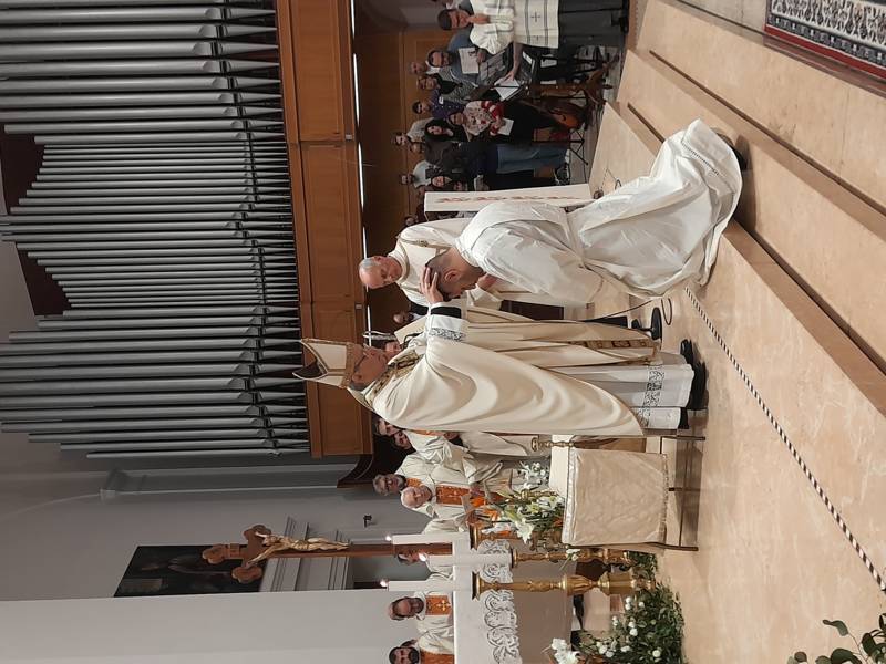 L’aiuto di Dio, della Madonna e dei Santi colmeranno e conforteranno le tue solitudini. L’amicizia con il presbiterio, che oggi qui ti accoglie, sia rimedio ad ogni tentativo di isolamento di fronte alle incomprensioni e alle difficoltà che la vita non fa mai mancare a nessuno. La misericordia di Dio, che oggi celebriamo, saprà sicuramente comprendere i tuoi limiti, ma tu non trattenerti da stendere la tua mano verso di Lui: troverai sempre una mano benevola, pronta ad accogliere e sorreggere la tua“.