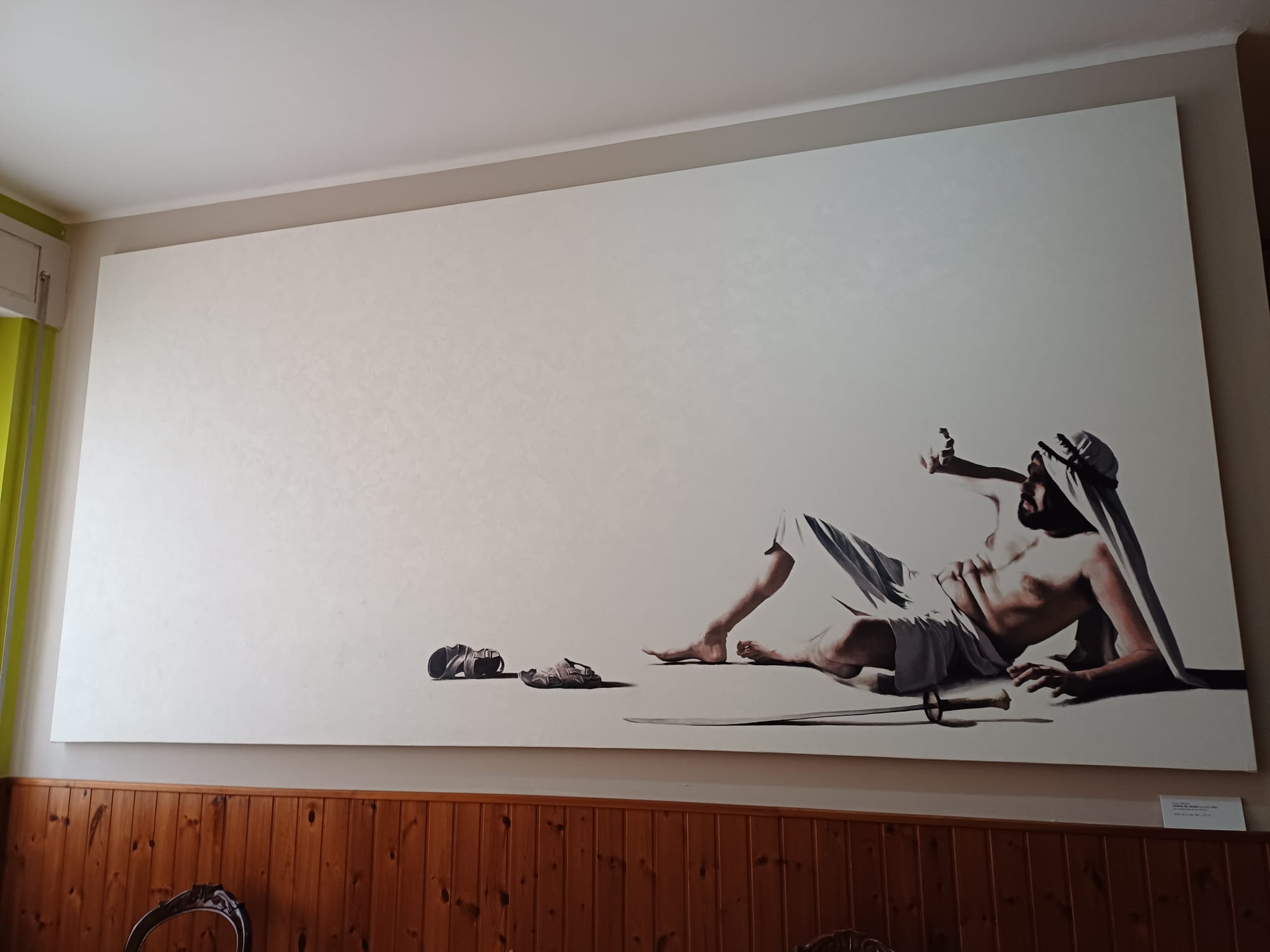 La prima opera realizzata – già sistemata all’ingresso degli uffici parrocchiali – è un olio su tela di 1,80 x 3,70 m, dallo stile figurativo e realista, per stessa definizione dell’artista Spadoni, che parla di un tentativo di ritrovare una capacità narrativa dell’arte, restituendole quella dimensione pittorica più aderente alla realtà e forse anche più popolare, perché più facilmente riconoscibile e in larga parte abbandonata dal Novecento ad oggi”. “Quando rappresento episodi biblici, sento la pittura come un servizio alla Parola – prosegue l’artista Spadoni, che ha conseguito il Diploma in Pittura all’Accademia delle Belle Arti di Urbino –. Il mio tentativo è quello di raccontare la storia in un modo che possa essere compreso ed interiorizzato dall’osservatore. In tal senso, dipingere una pagina evangelica non mi sembra molto diverso dallo scrivere un’omelia“.
