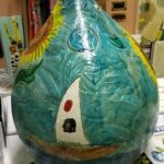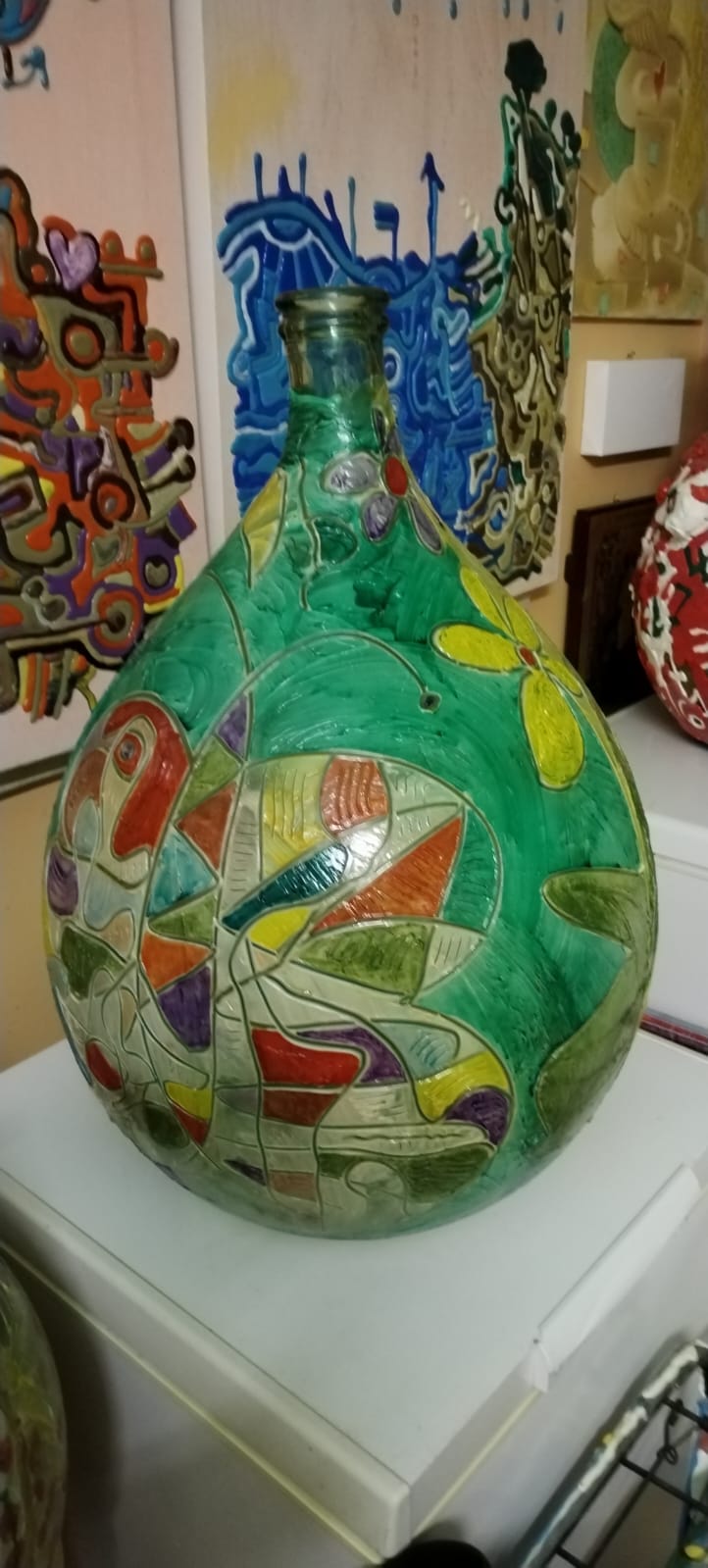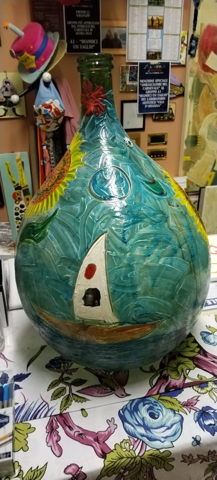 “Il Laboratorio – afferma Moscardelli – rientra nell’ambito di un’iniziativa dal titolo ‘Illumina l’oscurità’ che ha visto la luce circa vent’anni fa nel mio atelier. Negli anni ho avuto l’opportunità di esportare il mio progetto anche in altri centri, come ad esempio da sei anni la Caritas diocesana e da un paio d’anni Il Filo di Arianna. L’idea al centro del progetto è quella di usare delle damigiane di vetro, riciclate, che un tempo si usavano per riporre l’olio o il vino, per farne delle vere e proprie opere d’arte. Utilizziamo prima di tutto una resina per coprire il vetro; questa base, che simboleggia la terra, è la materia sulla quale poi dipingiamo le forme, con i colori all’acqua da me preparati. Quando la damigiana è pronta, inseriamo al suo interno delle catene di luce, come quelle natalizie o comunque decorative. Una volta accese, l’effetto che si ottiene è quello di una qualsiasi lampada, ma dalla forma originale ed anche impreziosita dall’incisione realizzata e dai colori dipinti“.