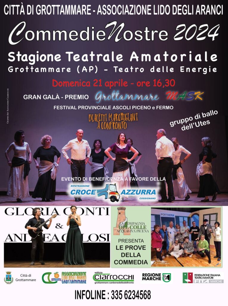 Prossimo appuntamento è per domenica 21 aprile alle ore 16,30 con la chiusura della stagione di Teatro Amatoriale e Dialettale di “Commedie Nostre” con il Gran Galà del “Grottammare mask”, la premiazione per la Compagnia vincitrice dell’edizione ed altri riconoscimenti, insieme al Premio “Dialetti a Confronto” in collaborazione con la Fita Regione Marche. Condurrà la serata la brava Gloria Conti, che salirà sul palco in doppia veste, visto che ci regalerà una collaborazione con il M° Andrea Galosi per uno spettacolo musicale unico e di altissimo livello. La show girl presenterà le “pizzicose” dell’Utes e la “Compagnia del Colle” di Acquaviva Picena, vincitrice dell’edizione 2023, che porterà in scena un nuovo pezzo dal titolo “Le prove della Commedia”, realizzato ad hoc per questa serata speciale.