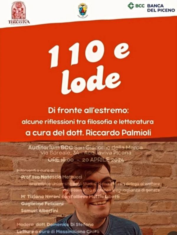 ACQUAVIVA PICENA – Sabato 20 aprile presso l’Auditorium “San Giacomo della Marca” della Banca del Piceno sito in via Boreale , si terrà dalle ore 18:00, il convegno “110 e lode, di fronte all’estremo: alcune riflessioni tra filosofia e letteratura”.