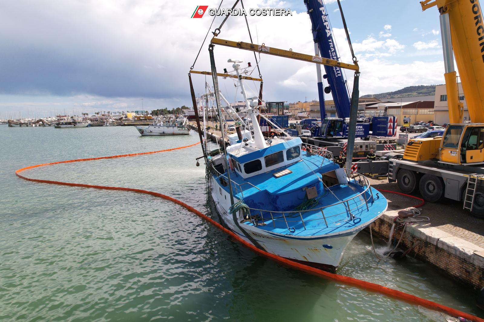 Sono appena terminate le lunghe, delicate e complesse operazioni di recupero del “Mostrillo” coordinate dalla Capitaneria di Porto di San Benedetto del Tronto in sinergia con il Comando dei Vigili del Fuoco di Ascoli Piceno e con il supporto del Nucleo Sommozzatori di Teramo. Il ripescaggio è avvenuto grazie anche al coinvolgimento di una ditta specializzata, proveniente da Civitanova Marche, che ha provveduto al sollevamento del relitto utilizzando due sistemi speciali a gru specifici per imbarcazioni pesanti.