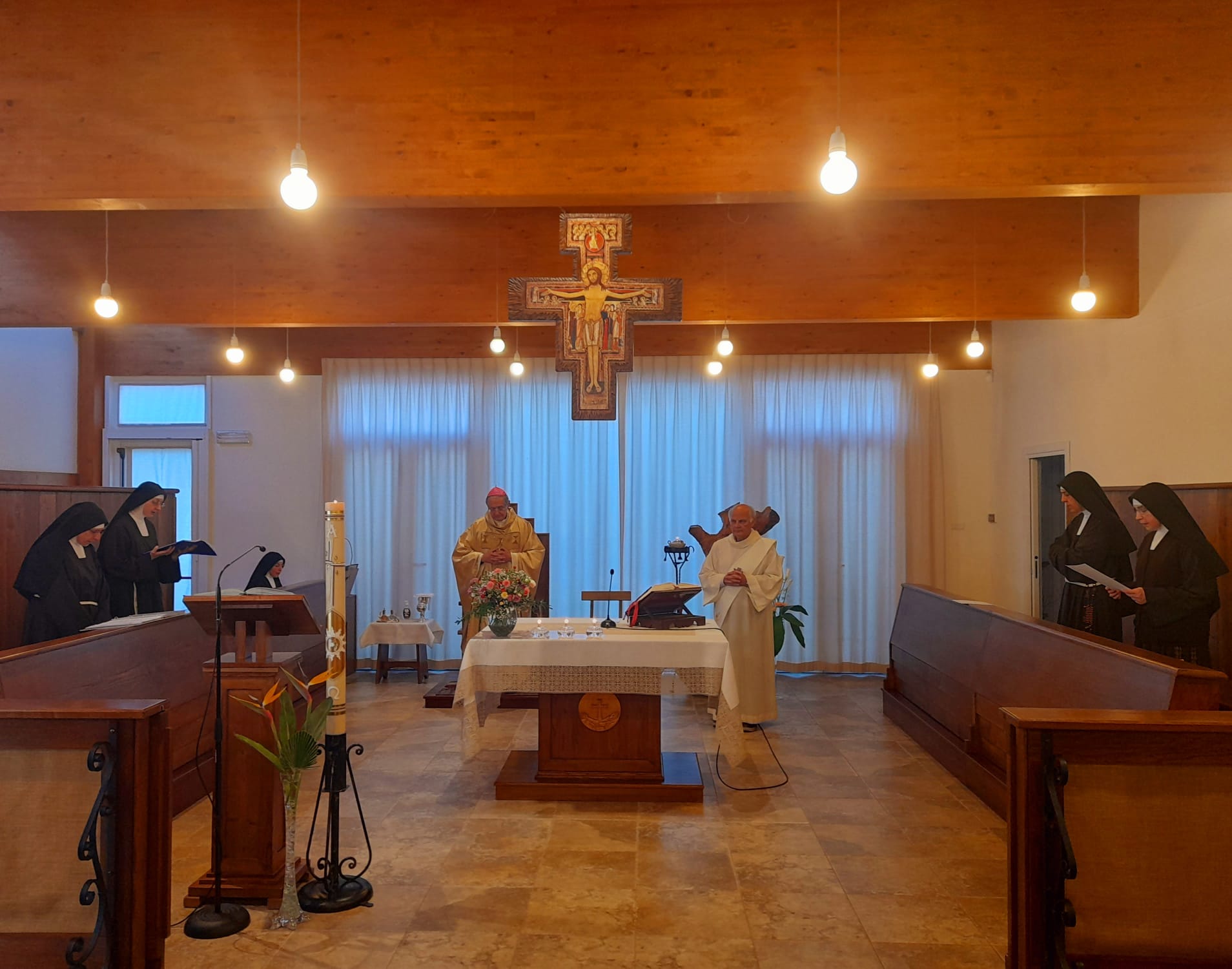 Al termine dell’incontro chi ha voluto si è spostato nella cappella adiacente al salone del Monastero Santa Speranza per pregare insieme i Vespri e poi concelebrare la Santa Messa, la cui Liturgia del giorno prevedeva il celebre brano evangelico di San Giovanni (Gv 15,1-8), in cui Gesù afferma: «Io sono la vite, voi i tralci. Chi rimane in me, e io in lui, porta molto frutto, perché senza di me non potete far nulla» . Queste le parole del vescovo Carlo Bresciani durante l’omelia: “C’è un verbo che ricorre frequente in questo brano: rimanere. Perché Gesù ripete così tante volte questo verbo? Perché sta aiutando i suoi apostoli e i suoi discepoli a capire cosa significhi seguire Lui, li sta aiutando a comprendere dove stia, dove risieda la vitalità della fede. Il paragone con la vite e i tralci serve a Gesù per dire che non solo noi siamo i tralci, quindi uniti a Lui che è la vite, ma che abbiamo bisogno della vite, ovvero della Sua linfa vitale. Quindi, se da una parte con il verbo rimanere sottolinea l’unità tra noi e Lui, dall’altra vuole anche sottolineare che questo rimanere non è un rimanere vuoto, passivo, bensì un rimanere che coglie, che prende linfa. Un rimanere che non varia a seconda delle stagioni, bensì è per sempre; un rimanere che attraversa le diverse vicende della vita, che è nel periodo primaverile ed estivo, quando le foglie crescono verdi e rigogliose e i frutti abbondanti, ma che è anche nell’autunno e nell’inverno, perché il rimanere è il presupposto di una sempre nuova vitalità. È un rimanere che è l’unico strumento che permette che la nostra vita cristiana non sia solo un sopravvivere, bensì porti molto frutto, come dice il testo evangelico. Qual è dunque il frutto di cui parla Gesù? Qual è la linfa che fa vivere la vite? L’amore per il Padre e l’amore per l’uomo. È questo che ha mosso tutta la vita di Gesù. Questo significa che il nostro rimanere in Gesù significa cogliere questa linfa e farla diventare la nostra stessa vita”.