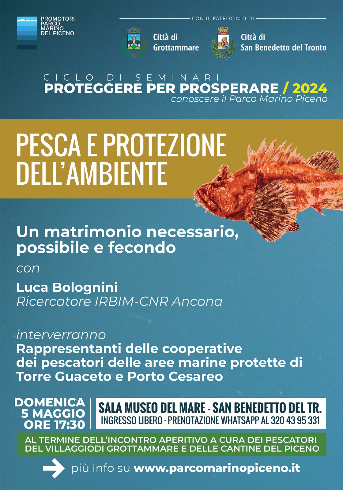 L’appuntamento, patrocinato anch’esso dai Comuni di San Benedetto e di Grottammare, sarà articolato in vari momenti. Nella prima parte sarà rappresentato come la Pesca possa essere un’attività esercitata nel rispetto dell’ambiente e programmata secondo i tempi necessari a non depauperare gli stock ittici. Il relatore sarà Luca Bolognini, ricercatore di notevole esperienza e competenza dell’Istituto per le Risorse Biologiche e Biotecnologiche Marine del CNR di Ancona. Nella seconda parte sarà invece possibile ascoltare direttamente le testimonianze di coloro che vivono della pesca nelle aree marine protette. I rappresentanti delle cooperative di pescatori di Torre Guaceto e Porto Cesareo infatti si collegheranno in diretta per raccontare la propria esperienza e le ragioni del loro sostegno all’istituzione delle Aree Marine Protette.