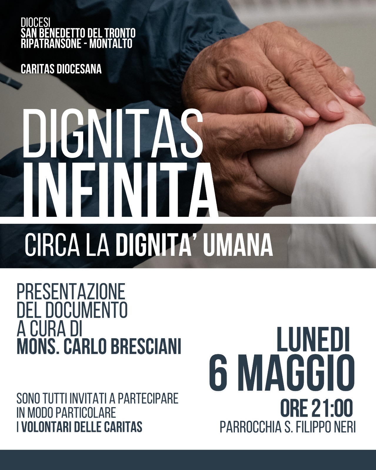 DIOCESI – Si terrà stasera, 6 Maggio 2024, alle ore 21:00, presso la Parrocchia San Filippo Neri in San Benedetto del Tronto, un incontro con il Vescovo Carlo Bresciani in cui verrà presentato il Documento del Dicastero per la Dottrina della Fede dal titolo “Dignitas Infinita – circa la dignità umana”.