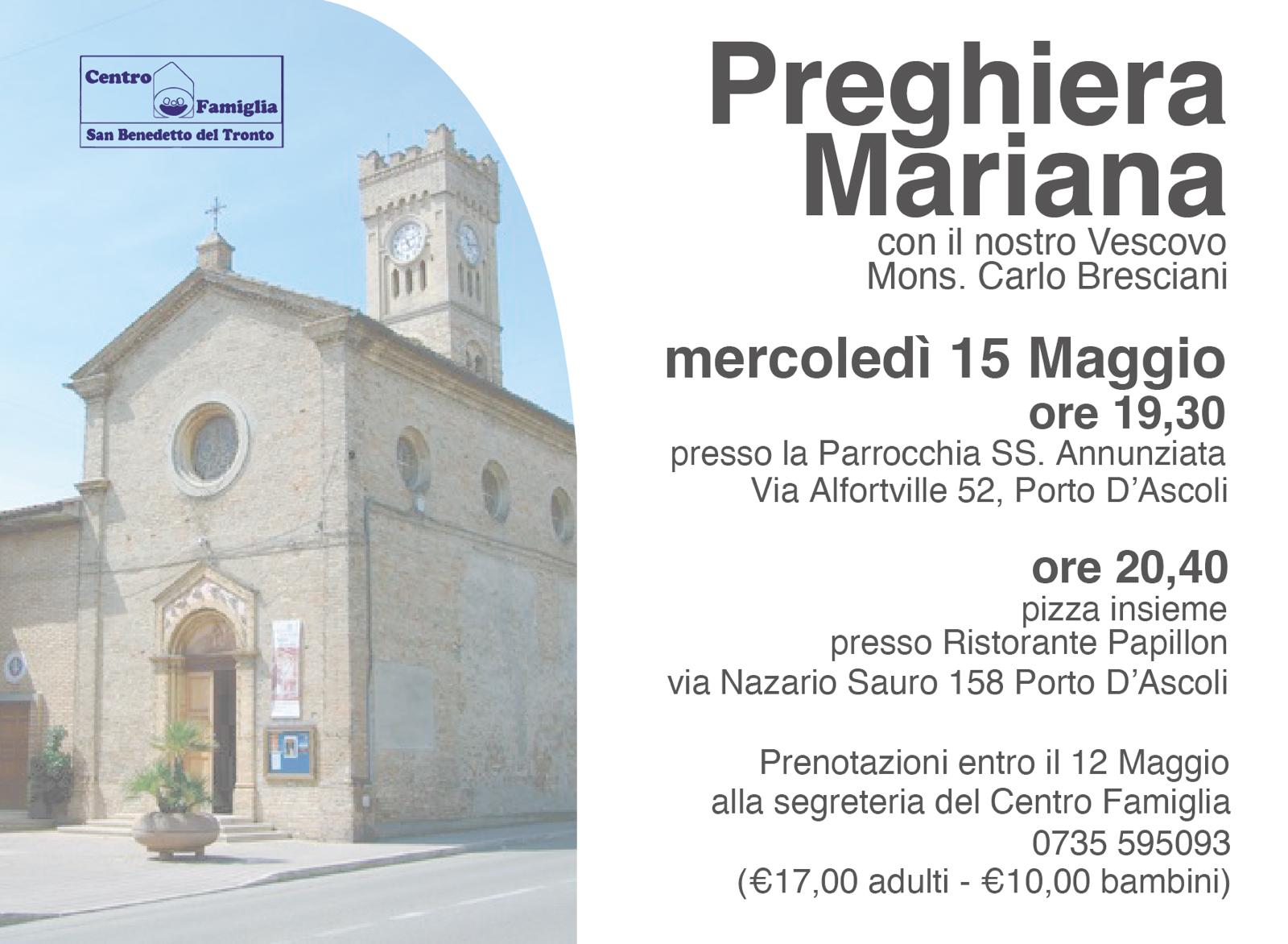 DIOCESI – Il Centro Famiglia, di San Benedetto del Tronto, organizza per mercoledì 15 maggio, alle ore 19.30, presso la Parrocchia Santissima Annunziata la “Preghiera Mariana” con il Vescovo Carlo Bresciani. Al termine del momento di preghiera i responsabili del Centro Famiglia invitano tutti a una cena insieme alle ore 20.40 presso il Ristorante Papillon.