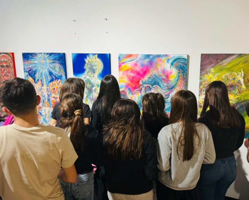 Mario ci ha accolto nel suo studio sul corso di Ripatransone e ci ha fatto sedere immergendoci fin da subito in un’atmosfera caratterizzata dalla bellezza: una musica di sottofondo e i colori delle sue opere appese alle pareti rendono lo studio un’oasi di pace, un luogo di ristoro per il pellegrino. E i ragazzi hanno ascoltato con grande attenzione la sua storia, ciò che lo ispira, ciò che lo muove a dipingere, ciò che attira la sua attenzione nel mondo in cui viviamo. Mario ci ha raccontato la sua vocazione di artista: cercare il bello che Dio mette nel creato e nella vita ed esprimerlo in modo da offrirlo allo sguardo dell’uomo. E ha invitato i ragazzi a guardare le opere esposte cercando di leggervi non solo quello che l’artista ha voluto esprimere, ma anche quello che l’opera stessa sta comunicando a chi si ferma e ci entra in dialogo. Da qui l’invito a cercare sempre il bello, il buono, il giusto perché ci sentiamo ristorati e restaurati dalla bellezza e dalla bontà che incontriamo sulla nostra via.