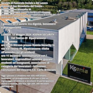 DIOCESI – “La data del 1° Maggio, memoria liturgica di San Giuseppe Lavoratore, riconsegna a tutti noi l’attenzione al mondo del lavoro con le sue complesse trasformazioni. Per questo motivo abbiamo voluto realizzare, proprio nel mese di Maggio, un incontro dal titolo “I giovani ed il lavoro – Tra dignità, benessere e protagonismo”. È con queste parole che Franco Veccia, direttore dell’Ufficio di Pastorale Sociale, del Lavoro e della Cura del Creato della Diocesi di San Benedetto del Tronto – Ripatransone – Montalto, presenta l’evento che si terrà Lunedì 13 Maggio, alle ore 9:15, presso l’Azienda “Ksenia Security” in Ripatransone.
