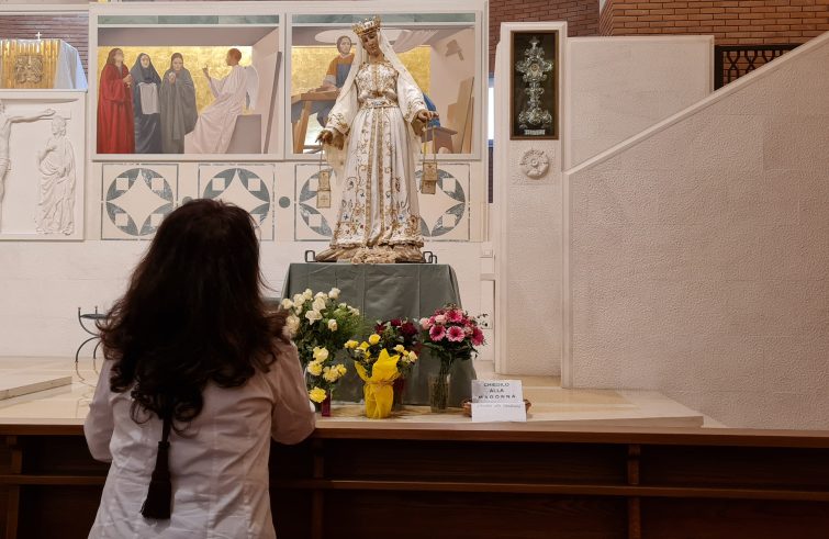Nella cappellina del Policlinico Universitario Campus Bio-Medico di Roma è un continuo e silenzioso pellegrinaggio di medici, studenti, pazienti, parenti. Fin dal mattino presto c’è chi cerca conforto nella fede per la propria guarigione o quella di una persona cara, chi esprime gratitudine per un esito positivo tanto atteso, chi semplicemente trova sollievo nel silenzio del luogo. Lo sguardo di tutti è rivolto verso la statua della Vergine Maria posta da lunedì accanto all’altare. È quella della Madonna del Carmine, a Trastevere venerata anche con i titoli Madonna Fiumarola o Madonna de’ Noantri, dalla Festa de’ Noantri che si celebra ogni anno a fine luglio nel quartiere. La storia del simulacro mariano affonda le sue radici nel XVI secolo, precisamente nel 1535. Secondo la tradizione, alcuni pescatori la trovarono alla foce del Tevere dopo una violenta tempesta. Da qui l’appellativo “Madonna Fiumarola”. Inizialmente donata ai carmelitani della basilica di San Crisogono, la statua assunse il titolo di “Madonna del Carmine”. Qui rimase fino al 1890, quando venne trasferita nella chiesa di San Giovanni dei Genovesi. La sua sede definitiva divenne poi la chiesa di Sant’Agata, dove risiede ancora oggi. In preparazione della festa liturgica del Beato Álvaro del Portillo, ispiratore del Campus, la cui memoria si celebra il 12 maggio, la statua della Madonna è stata portata lunedì scorso al policlinico per il terzo anno consecutivo. Oggi, giovedì 9 maggio, sarà celebrata la Messa presieduta da don Giovanni Manfrini, vicario regionale dell’Opus Dei per l’Italia. Domani, venerdì 10 maggio, la statua tornerà a Sant’Agata. Il pellegrinaggio è stato organizzato dal cappellano don Robin Weatherill il quale si dice “certo che la Madonna sta toccando il cuore di tante persone e i frutti si vedranno con il tempo”. Si ritiene un “privilegiato” perché sempre a contatto con l’uomo “con tutta la sua fragilità e ingenuità. Nelle corsie di un ospedale le maschere cadono e si hanno davanti i veri bisogni”. E sono questi che vengono portati alla Vergine Madre. Fede, devozione, dolore si mischiano nella cappella al piano terra. Alessandro, studente del corso di laurea Tecniche di Radiologia Medica, prima di andare a lezione si ferma qualche minuto in preghiera. Ha fissato a lungo il volto della Vergine prima di scrivere un messaggio su biglietto che ha poi posto in uno dei cestini sistemati ai piedi della statua pieni di post-it colorati con suppliche e richieste di preghiere.