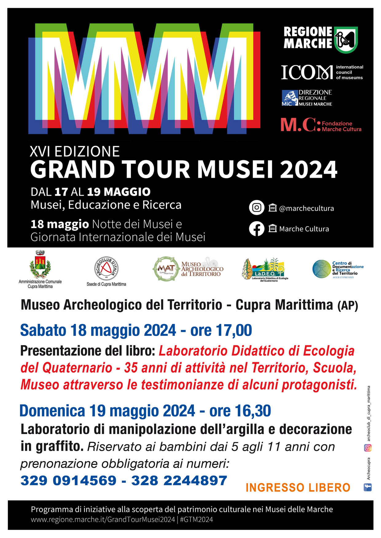CUPRA MARITTIMA – Nell’ambito del Gran Tour Musei Marche, sabato 18 maggio alle ore 17,00, presso il Museo Archeologico del Territorio di Cupra Marittima dall’Archeoclub di Cupra verrà presentato il volume ” Il Laboratorio Didattico di Ecologia del Quaternario, 35 anni di attività . Territorio, Scuola, Museo.”