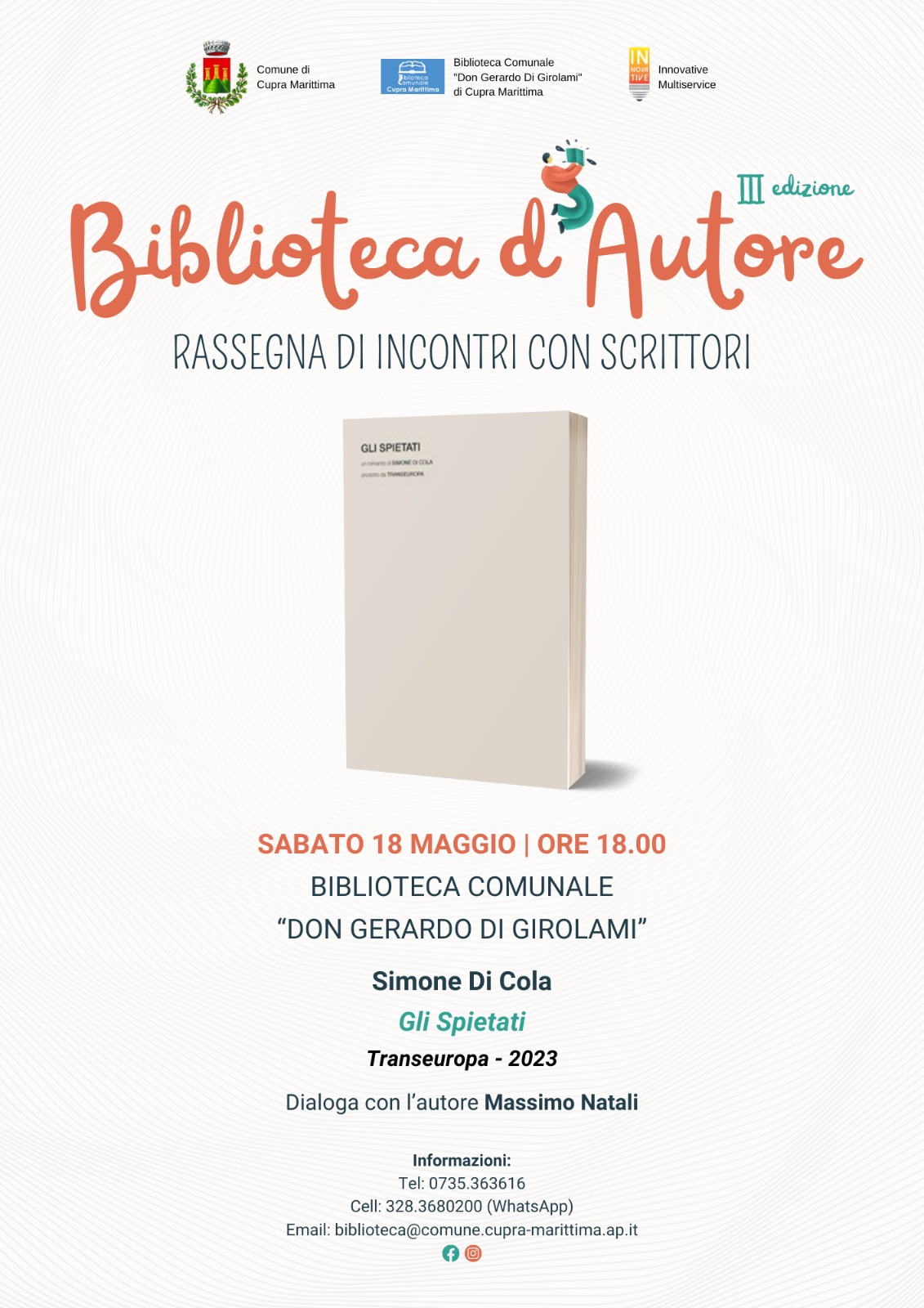 CUPRA MARITTIMA – Torna l’imperdibile appuntamento di Biblioteca d’Autore, sabato 18 maggio alle ore 18.00, presso la Biblioteca Comunale “Don Gerardo Di Girolami”.
