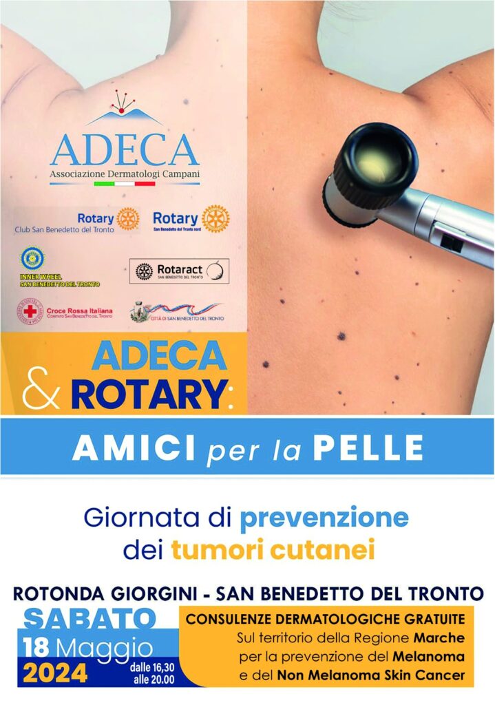 SAN BENEDETTO DEL TRONTO – Sabato 18 Maggio, dalle 16.30 alle 20.00, in Piazza Giorgini a San Benedetto del Tronto, si terrà un evento dedicato alla prevenzione dei tumori cutanei. L’iniziativa, organizzata a livello nazionale dalla Società Scientifica ADECA, dall’Inner Wheel e dal Rotary Club di San Benedetto del Tronto ,in collaborazione con il Rotary Club San Benedetto del Tronto Nord, il Rotaract di San Benedetto del Tronto e la Croce Rossa locale, con il patrocinio del Comune di San Benedetto del Tronto, ha l’obiettivo di sensibilizzare la cittadinanza sull’importanza della diagnosi precoce del melanoma e di altre forme di tumore della pelle.