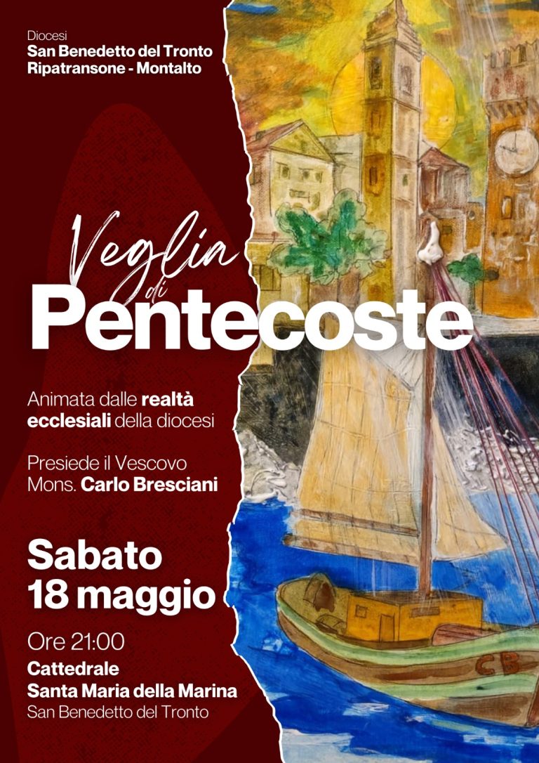 La comunità cristiana della diocesi di San Benedetto del Tronto – Ripatransone – Montalto, si ritroverà insieme, questa sera, sabato 18 maggio, alle ore 21.00, presso la Cattedrale Madonna della Marina, per celebrare la Veglia di Pentecoste, animata dalle diverse realtà ecclesiali. La solenne celebrazione sarà presieduta dal Vescovo Carlo Bresciani.