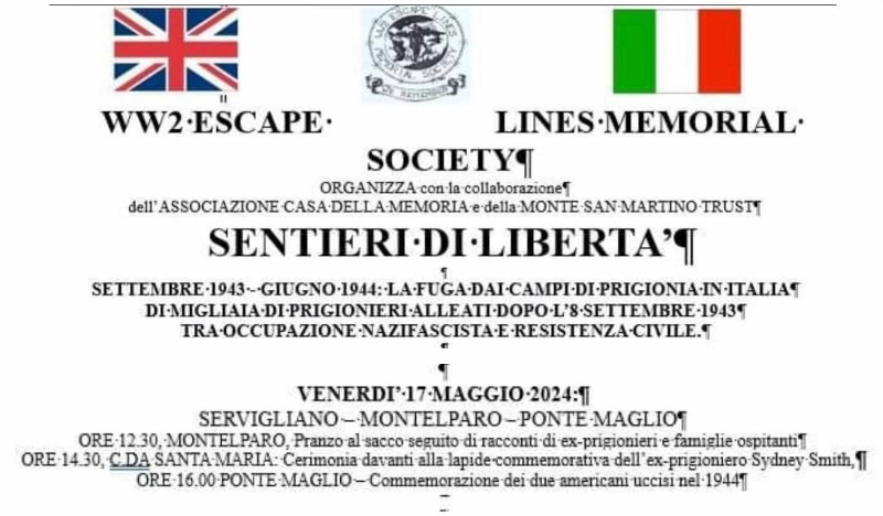 L’Associazione WW2 Escape Line Memorial Society (WW2 ELMS) con sede in Harrogate in Gran Bretagna si occupa di ricerca storica ricostruendo il percorso umano e militare dei soldati prigionieri e delle famiglie che li hanno aiutati. Nel 2015, dopo varie interviste agli anziani montelparesi e serrate ricerche in molteplici archivi internazionali, riuscirono a scoprire l’identità del soldato assassinato dai nazifascisti nella contrada Santa Maria in Camurano, nella lontana primavera del 1944. Organizzando i Sentieri di Libertà la WW2 ELMS, in sinergia con l’Associazione Monte San Martino Trust con sede a Londra e la Casa della Memoria di Servigliano, hanno scelto perciò di fare tappa anche a Montelparo in una delle 4 giornate dedicate all’evento anche per rendere omaggio al sacrificio dei prigionieri alleati e alle famiglie che li hanno nascosti e ospitati.