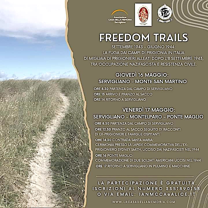 “FREEDOM TRAIL” (sentieri di Libertà) sono le camminate commemorative che partendo dal Parco della Pace di Servigliano, (fu Campo di Prigionia denominato “CPG-59”, ora sede dell’Associazione La Casa della Memoria) ripercorrono i passi dei prigionieri di guerra alleati in fuga, giungendo nei luoghi dove si sono consumati i più significativi, spesso tragici, avvenimenti di resistenza civile dopo l’8 settembre 1943.