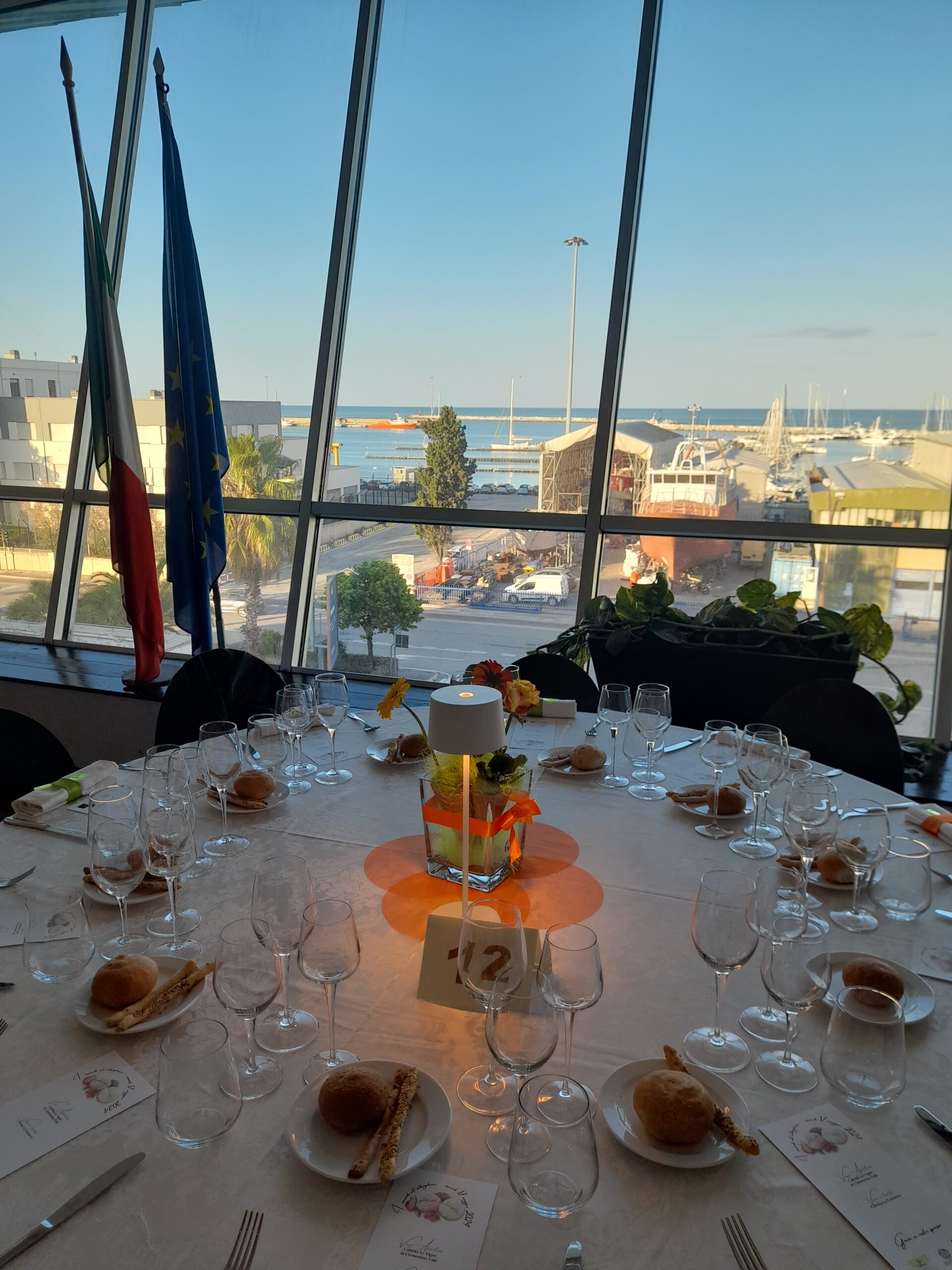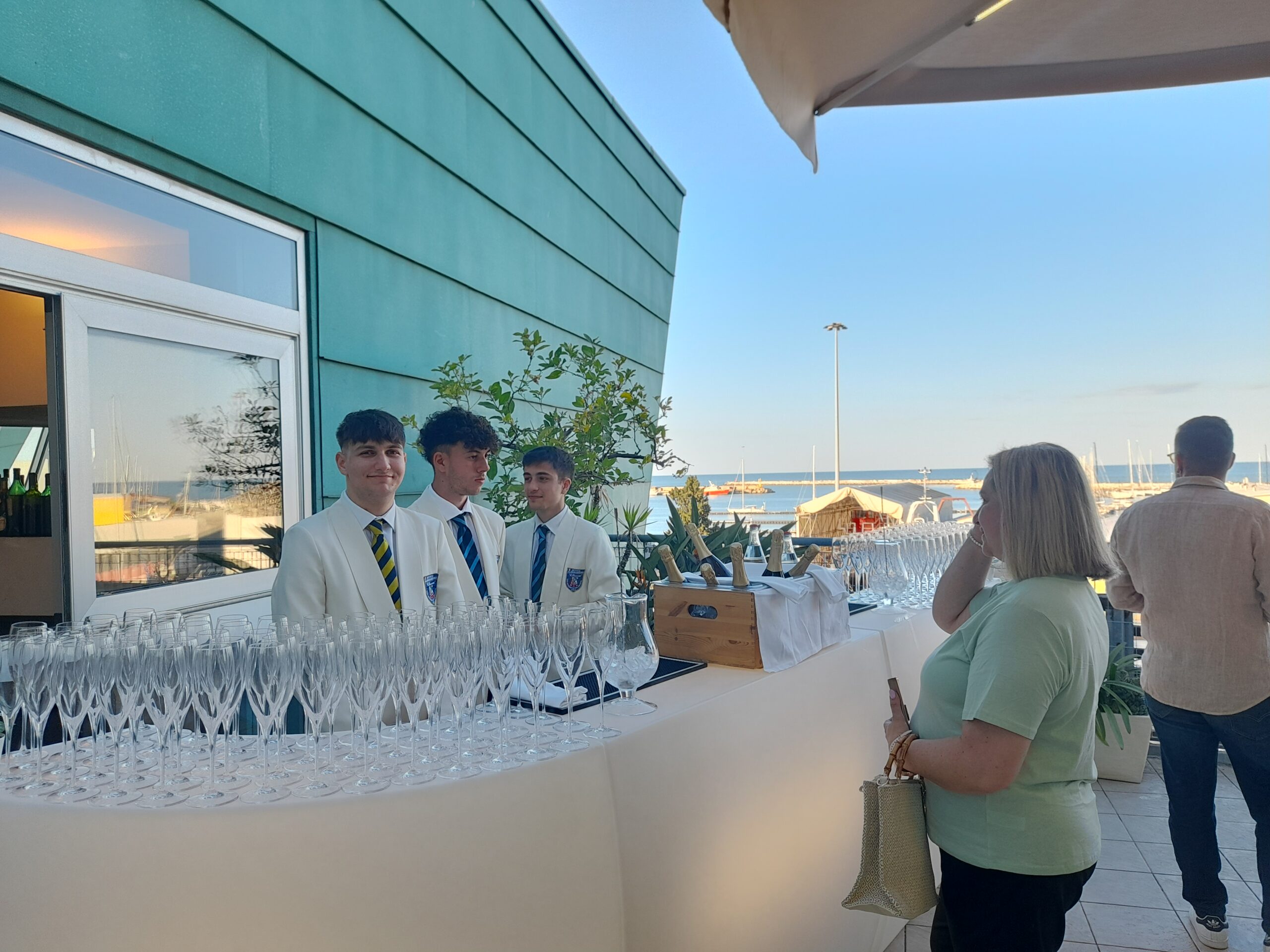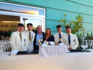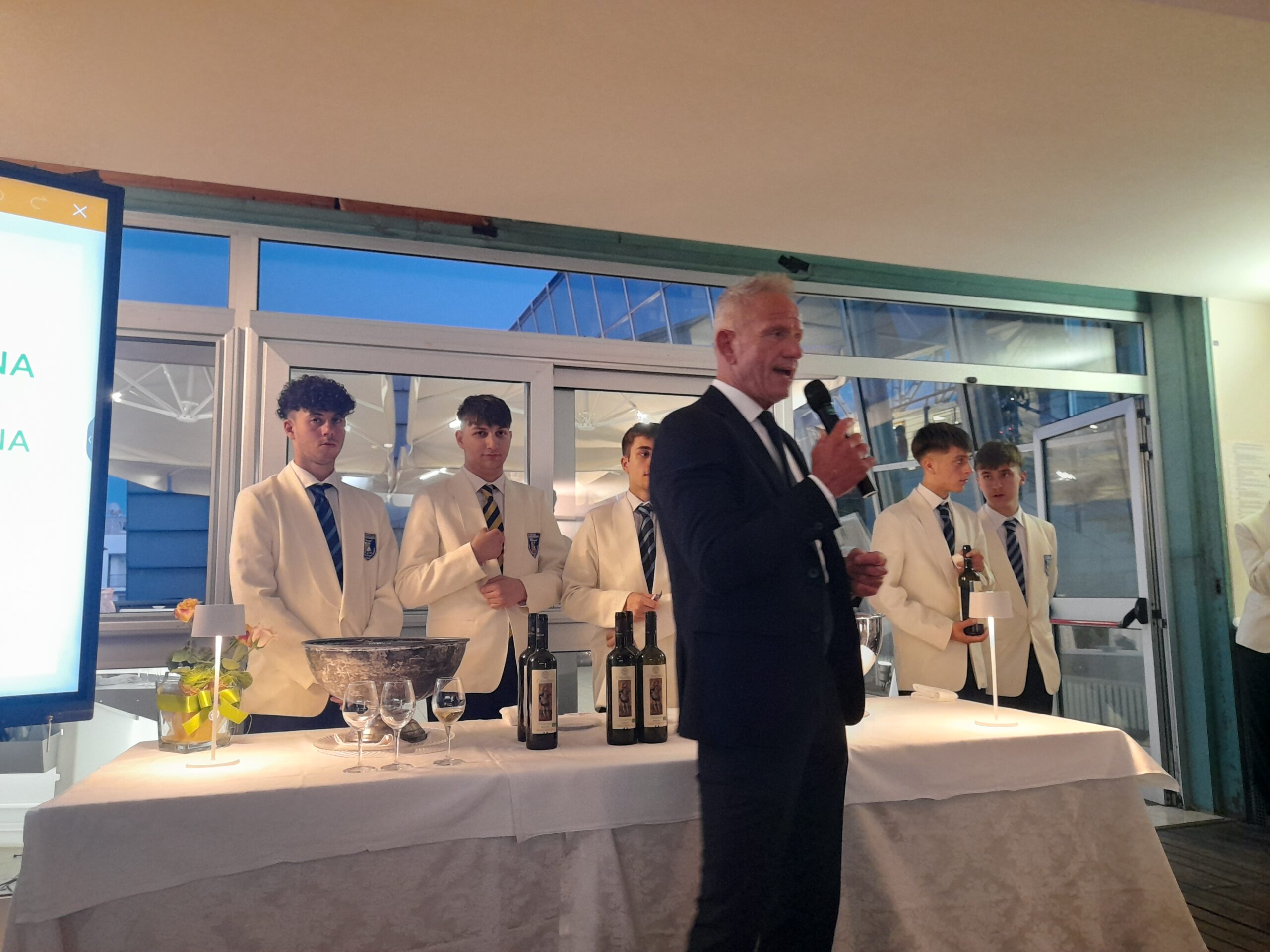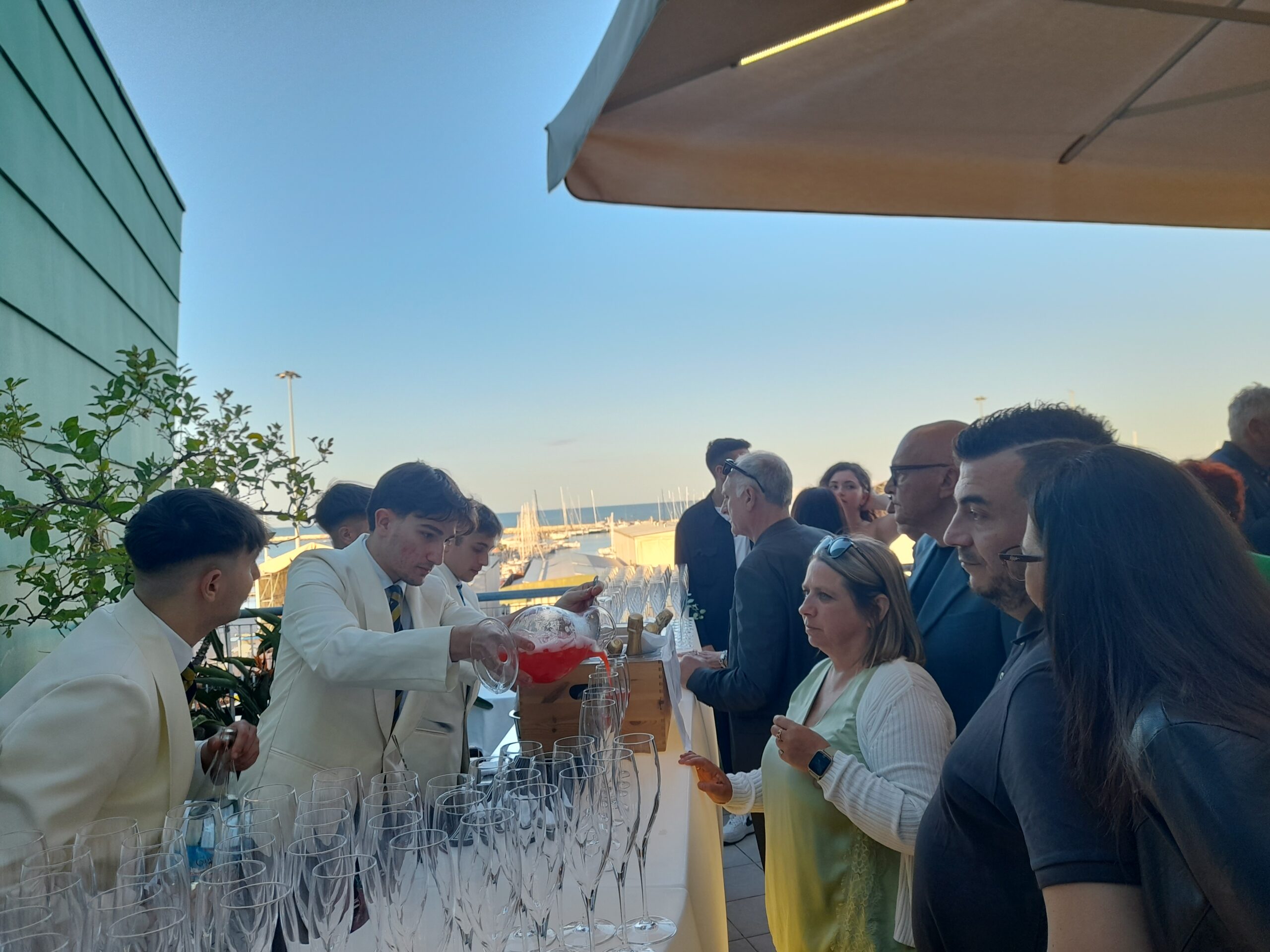 Nicola Boniolo, in rappresentanza dell’Azienda Vitivinicola Le Vigne di Clementina Fabi, ha detto: “La nostra azienda si trova a Montedinove, a circa 500 mt sopra il livello del mare, dove abbiamo diciotto ettari di produzione. Stasera siamo stati presenti all’evento dell’Alberghiero con la nostra passerina, Terre di Offida DOC, spumantizzata in cantina con il metodo Martinotti – o Charmat, che dir si voglia –, le cui bollicine hanno ben accompagnato l’aperitivo gustato in terrazza. Brindare in questa splendida cornice con vista sul mare, ha aggiunto al piacere del palato anche quello degli occhi. Un po’ come facciamo anche nella nostra cantina, in cui abbiamo una sala degustazione con piscina in cui gli ospiti possono assaggiare le nostre eccellenze, ammirando scorci suggestivi dei Monti Sibillini. Le nostre sinuose colline, infatti, negli ultimi anni iniziano ad attrarre un turismo wellness, fatto di passeggiate salutari nella natura incontaminata o di attività sportive come il ciclismo, che si affianca a quello enogastronimico e che ne diventa motore e propulsore”.