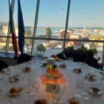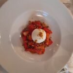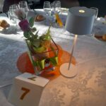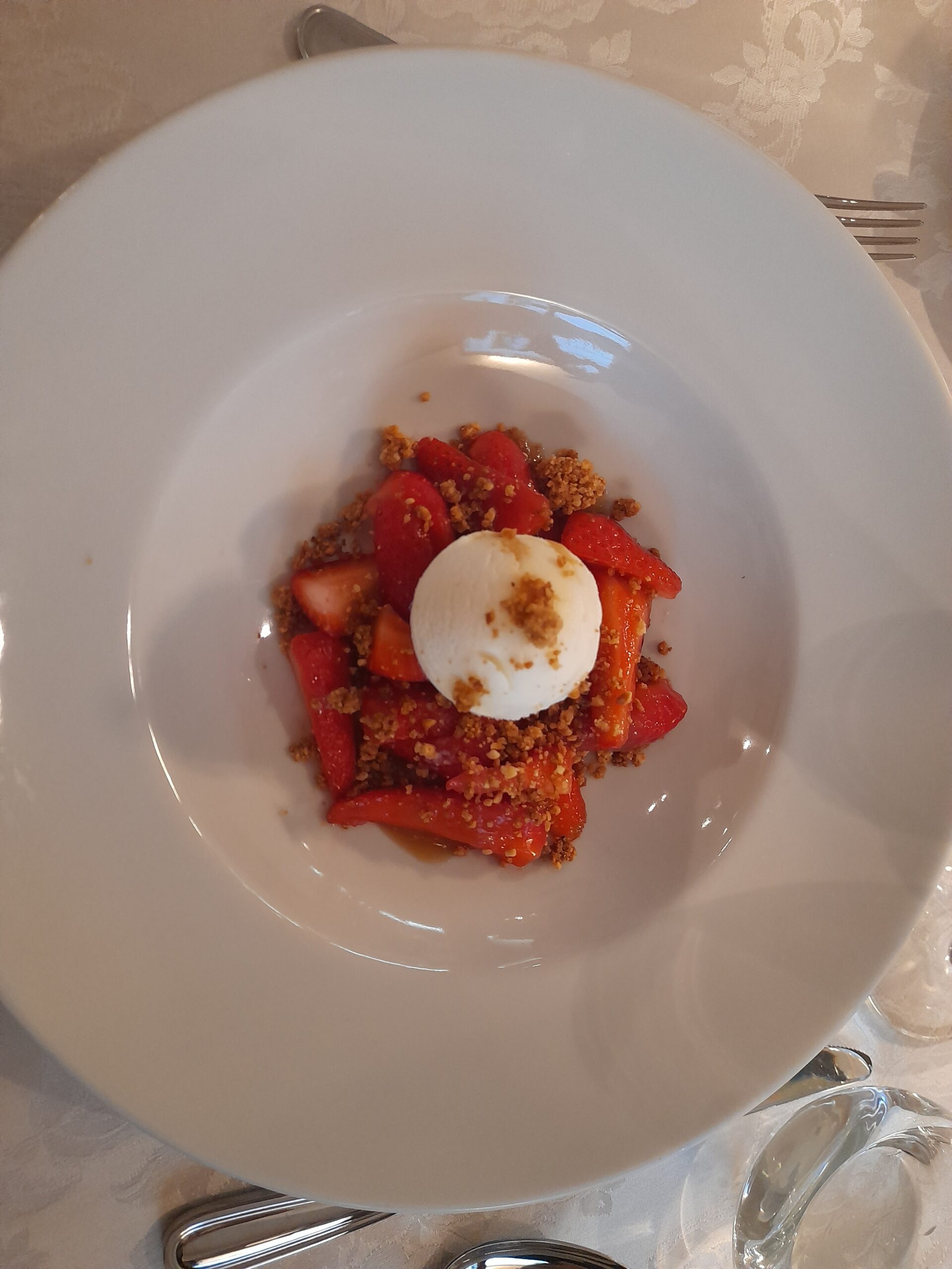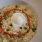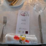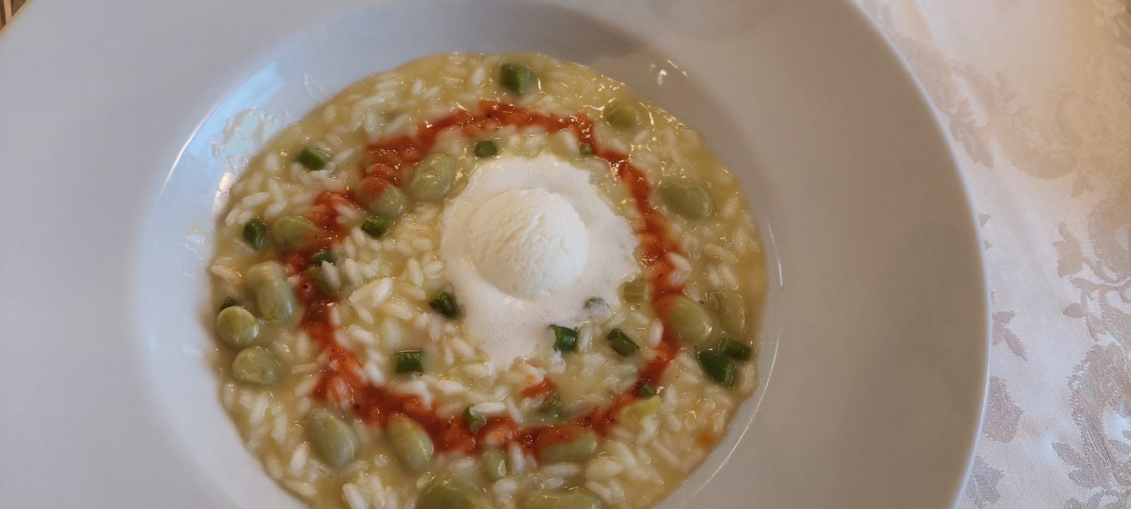 Ecco dunque nel dettaglio il menù della serata. Oltre all’aperitivo Rossini del Piceno, gustato in terrazza con splendida vista sul mare al tramonto, gli ospiti hanno dato inizio alle danze con un girello di vitello marinato con indivia belga e pinoli tostati, accompagnato da gelato al finocchio selvatico e olive verdi candite. A seguire i commensali hanno potuto gustare un primo piatto assolutamente originale: riso Carnaroli con fave fresche e asparagi con crema di rapa rossa, accompagnato da gelato al pecorino di Fossa. Anche il secondo è stato una vera sorpresa che ha inaspettatamente deliziato i palati degli ospiti intervenuti: faraona farcita in crosta di creta con cipolla bianca Margherita IGP gratinata, abbinata a gelato alla cipolla. La cena si è chiusa con una cascata di fragole accompagnate da gelato alla ricotta e sapa e crumble alle mandorle.