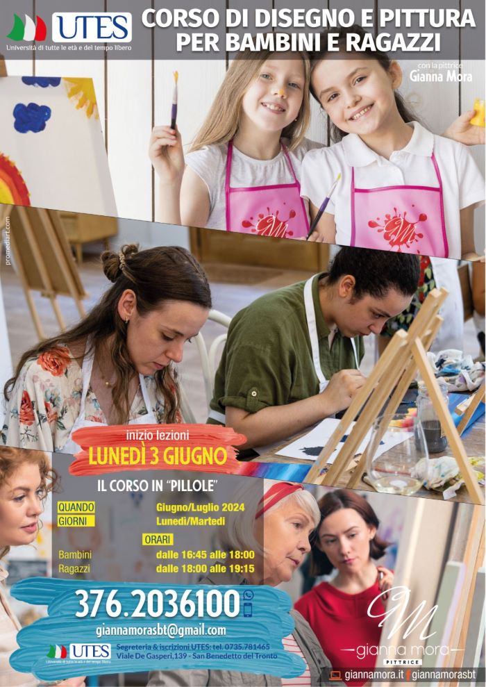 SAN BENEDETTO DEL TRONTO – Durante i mesi di giugno e luglio sarà possibile frequentare il corso di disegno e pittura tenuto dalla prof.ssa Gianna Mora. Un corso che sarà realizzato in collaborazione con l’UTES (Università di tutte le età e del tempo libero). Il corso è rivolto a bambini e ragazzi, ognuna di queste categorie avrà un preciso orario. L’inizio delle lezioni è fissato per lunedì 3 giugno. Il programma prevede: i lunedì e i martedì di giugno e di luglio 2024; per i bambini il corso inizierà alle ore 16:45 e terminerà alle 18:00, per i ragazzi il corso inizierà alle ore 18:00 e terminerà alle 19:15.