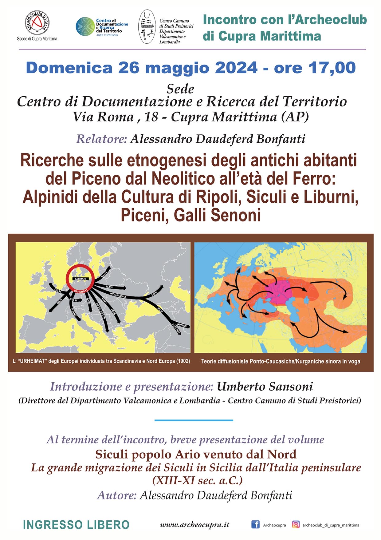 CUPRA MARITTIMA – Domenica 26 maggio 2024, a cura dell’Archeoclub di Cupra Marittima presso la sede del Centro di Documentazione e Ricerca del Territorio di Cupra Marittima in Via Roma 18, si terrà la conferenza dell’archeologo Alessandro Bonfanti dal titolo “Ricerche sulle etnogenesi degli antichi abitanti del Piceno dal Neolotico all’età del Ferro: Alpinodi della cultura di Ripoli, Siculi e Liburni, Piceni, Galli Senoni”.