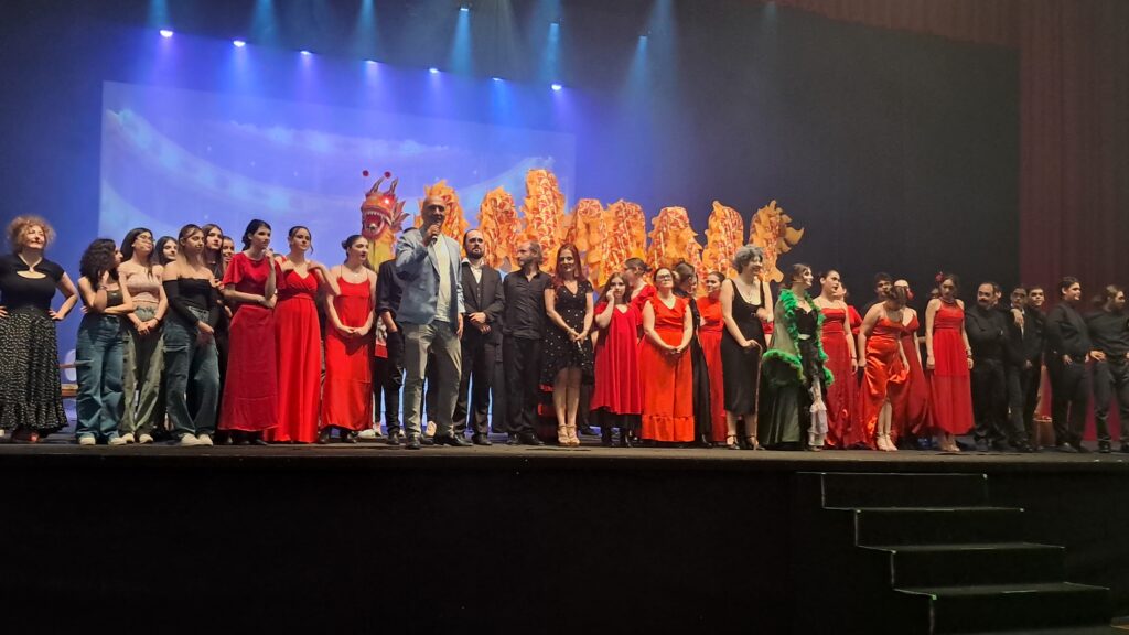 SAN BENEDETTO DEL TRONTO – Gran successo per il musical in lingua “La bella Otero – L’ultima intervista”, messo in scena al Palariviera con un matinée completamente riservato a studenti, insegnanti e personale ATA dell’Istituto, preceduto da una breve conferenza illustrativa e seguito da un dibattito aperto alle domande degli spettatori.  Lo spettacolo, unico nel suo genere, ha appassionato gli spettatori, in particolar modo gli alunni dell’Istituto Tecnico del settore Economico e del Liceo Linguistico: un musical originale, cantato e recitato in francese, spagnolo, inglese, tedesco e cinese, le cinque lingue studiate al “Capriotti”, con la musica interamente suonata dal vivo, i cui testi e coreografie sono stati ideati dalla prof.ssa Paola Sguerrini, già nota per la produzione di diversi musical prodotti sin dal 2002 anche all’estero.