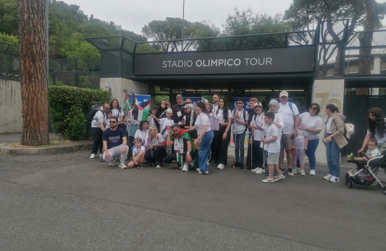 In pochissimo tempo un pezzetto della tribuna laterale della Tribuna Montemario si è trasformato in un angolo di Palestina, visibile anche da lontano per il continuo sventolio di bandiere nazionali, di costumi tipici indossati da alcune bambine che ne hanno fatto sfoggio in mezzo ai loro coetanei. Tanti sorrisi ma poca voglia di parlare.