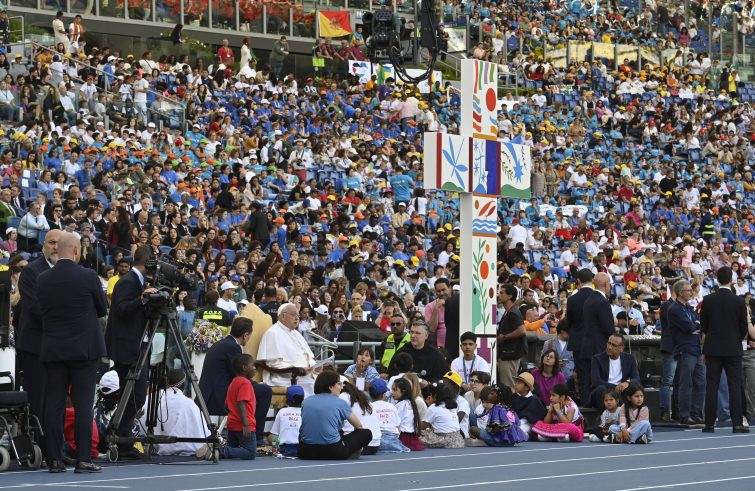 Dialogando con i bambini allo Stadio Olimpico, per il primo atto della Giornata mondiale dei bambini, il Papa ha fatto plasticamente vedere cosa significa fare pace, dando lui stesso la pace ad uno dei piccoli.