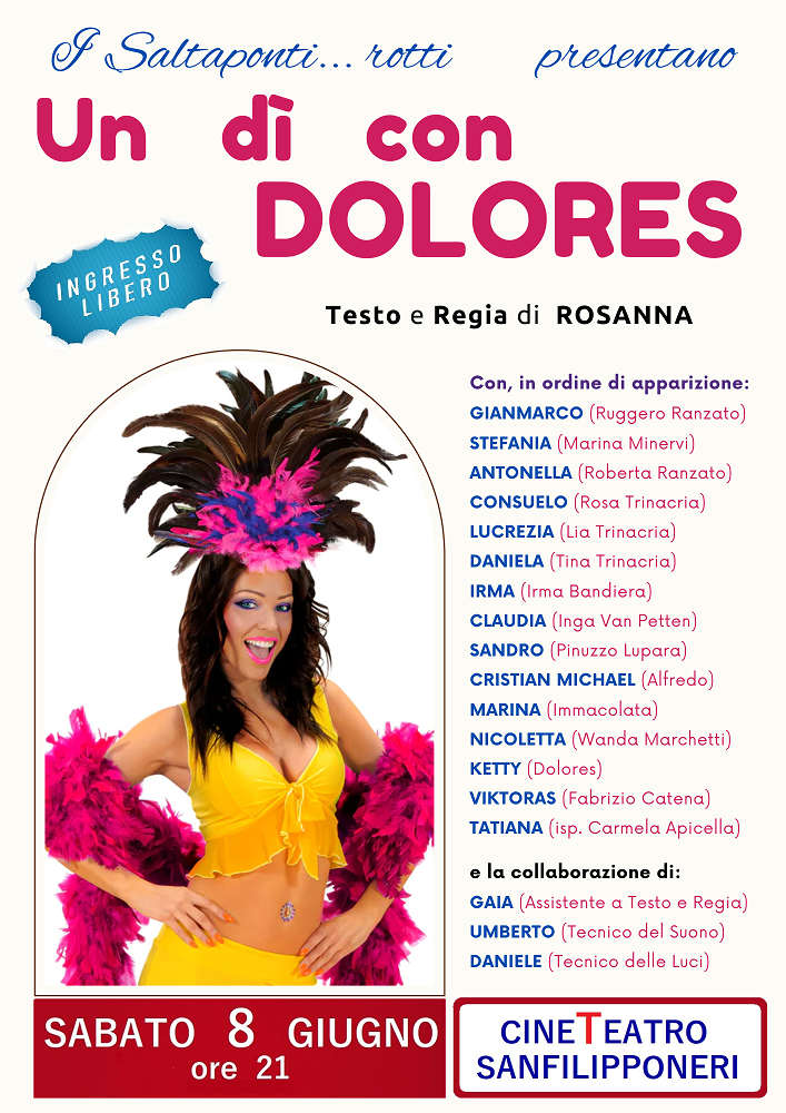“Un dì con Dolores” verrà portato in scena dalla Compagnia “I Saltaponti… rotti” sabato 8 giugno alle ore 21 precise nel teatro San Filippo Neri di San Benedetto del Tronto. L’ingresso è libero.