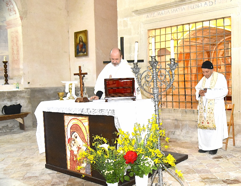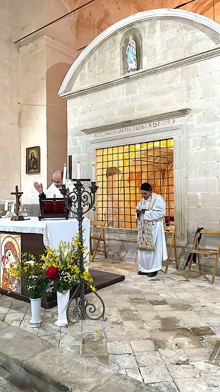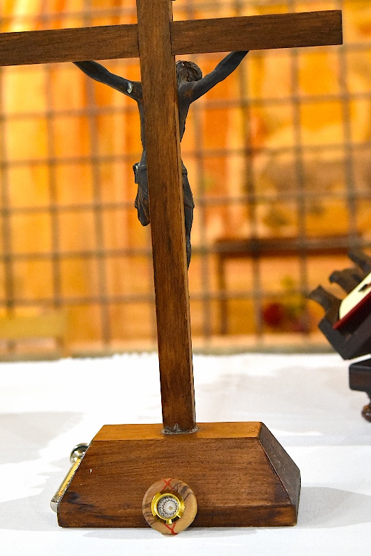 La Santa Messa è terminata con una bellissima sorpresa offerta da Don Giorgio ai presenti: ha mostrate le reliquie di “Santa Maria di Cristo Crocefisso” da lui avute in dono dalle suore Carmelitane del convento di Betlemme che ha recentemente visitato! Egli ha spiegato brevemente le origini e la storia di quella Santa Maria Baouardy, che nasce il 5 Gennaio 1846 in un villaggio palestinese in Galilea, nei pressi di Nazaret, da genitori di origini libanesi, appartenenti alla Chiesa cattolica greco-melchita. Rimane orfana di entrambi i genitori a 3 anni. Racconterà, lei stessa, che a 13 anni, fuggendo da casa perché lo zio con cui viveva voleva costringerla a sposarsi, si imbatte in un musulmano che vuole obbligarla a rinnegare la sua fede cristiana. Al suo rifiuto, il giovane le taglia la gola e la lascia in fin di vita in una strada di Alessandria. Si risveglia in una grotta, accudita e curata da una donna misteriosa, nella quale Maria riconosce la Vergine Maria. Maria a 19 anni entra come novizia nella residenza marsigliese delle Suore di San Giuseppe dell’Apparizione, dove, sotto la guida di Madre Veronica della Passione, prenderà il nome religioso di Suor Maria di Gesù Crocifisso. Portatrice di stimmate muore giovanissima a soli 32 anni. Beatificata nel 1983 da papa Giovanni Paolo II, è stata proclamata Santa da papa Francesco il 17 Maggio del 2015.