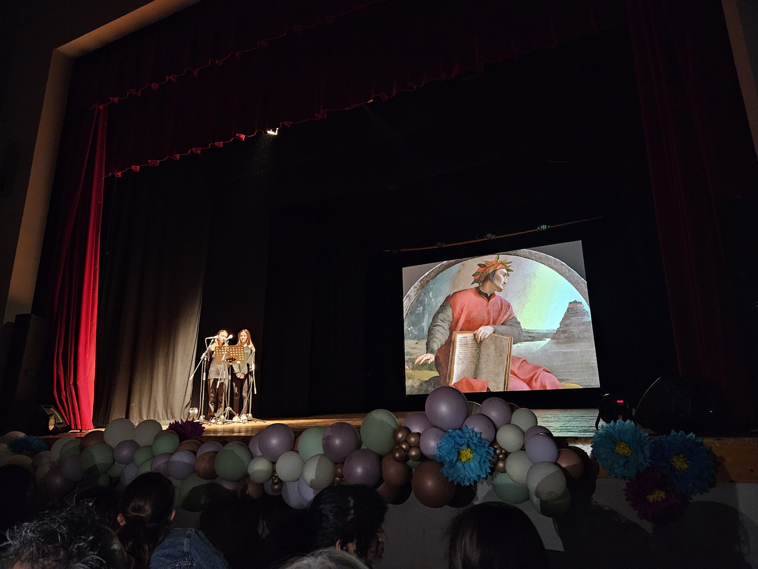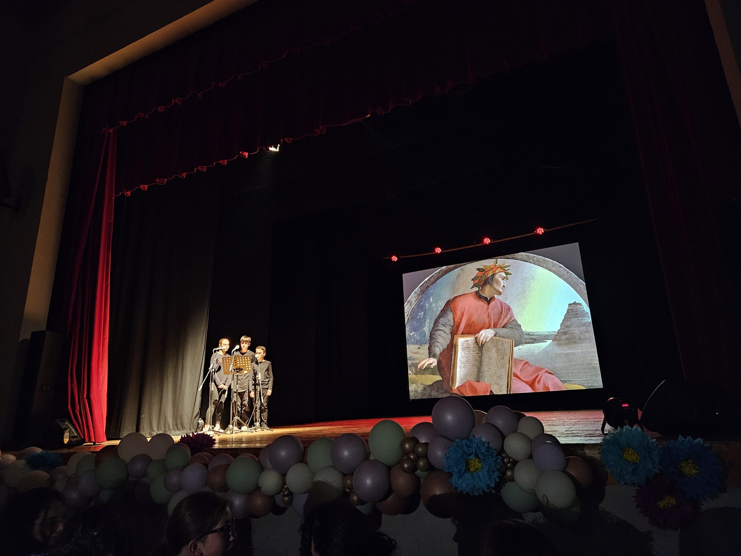 La Divina Commedia di Dante è stata interpretata con tre scene, rappresentanti gli aspetti salienti della Somma Opera, l’Inferno, il Purgatorio ed il Paradiso. Il copione è stato curato dalla professoressa Daniela Di Marco, coadiuvata dalle Prof.sse Teresita Eusebi e Lucilla Cappella. A presentare lo spettacolo, il noto presentatore radiofonico Luca Sestili, tra l’altro presidente di Istituto dello staff scolastico in questione.