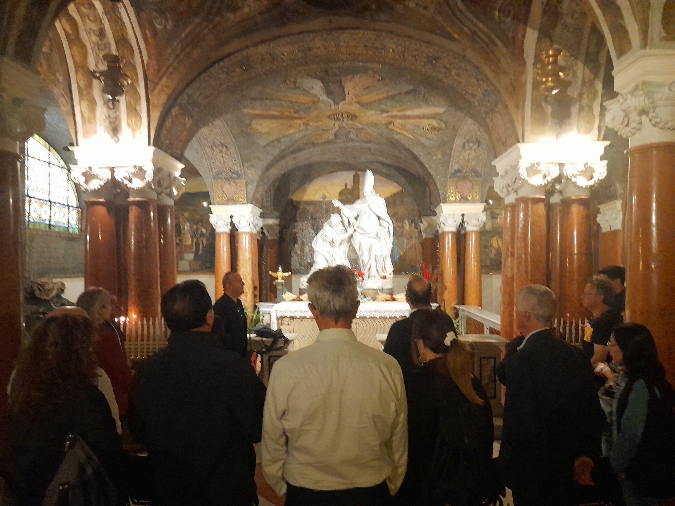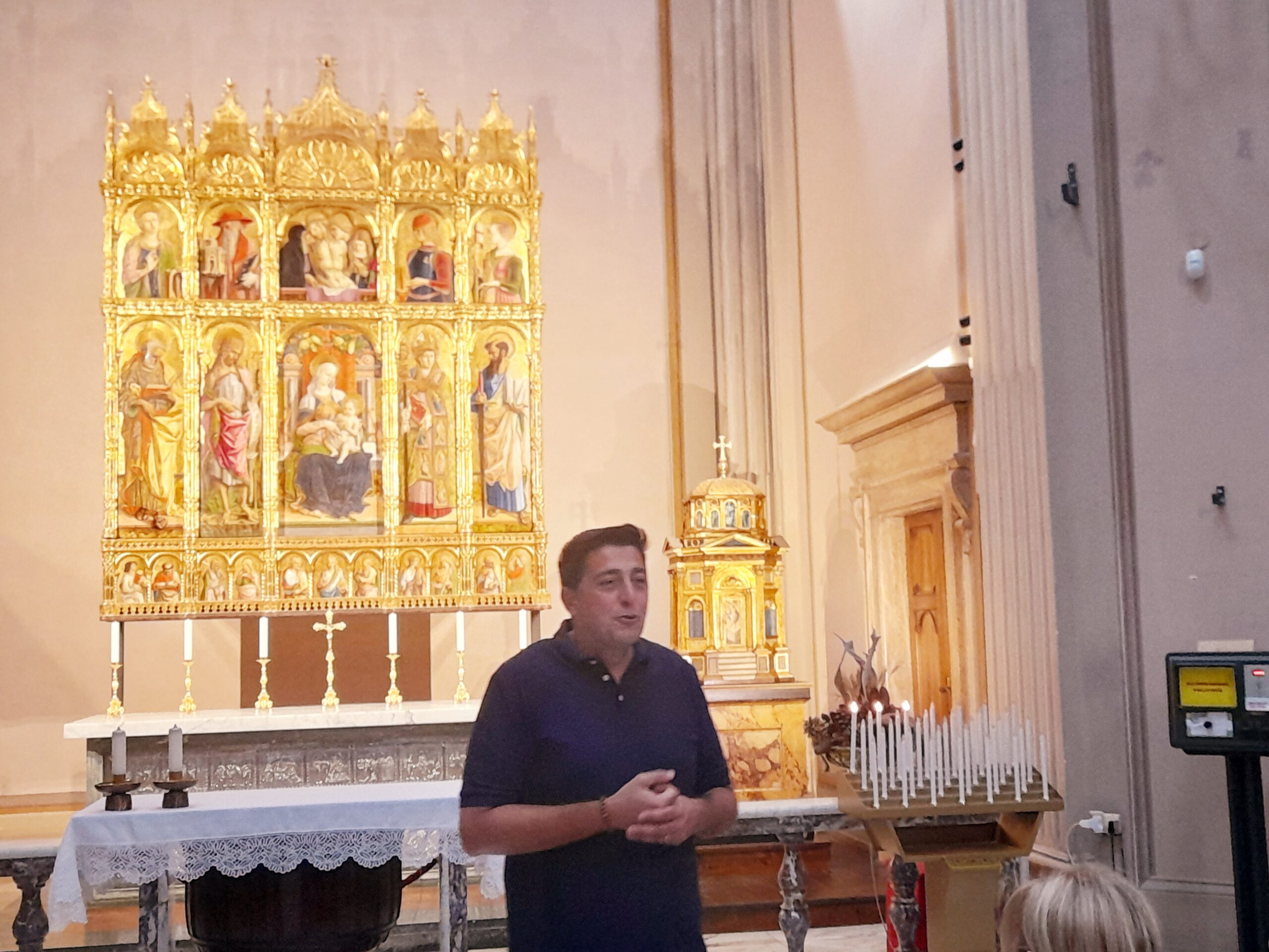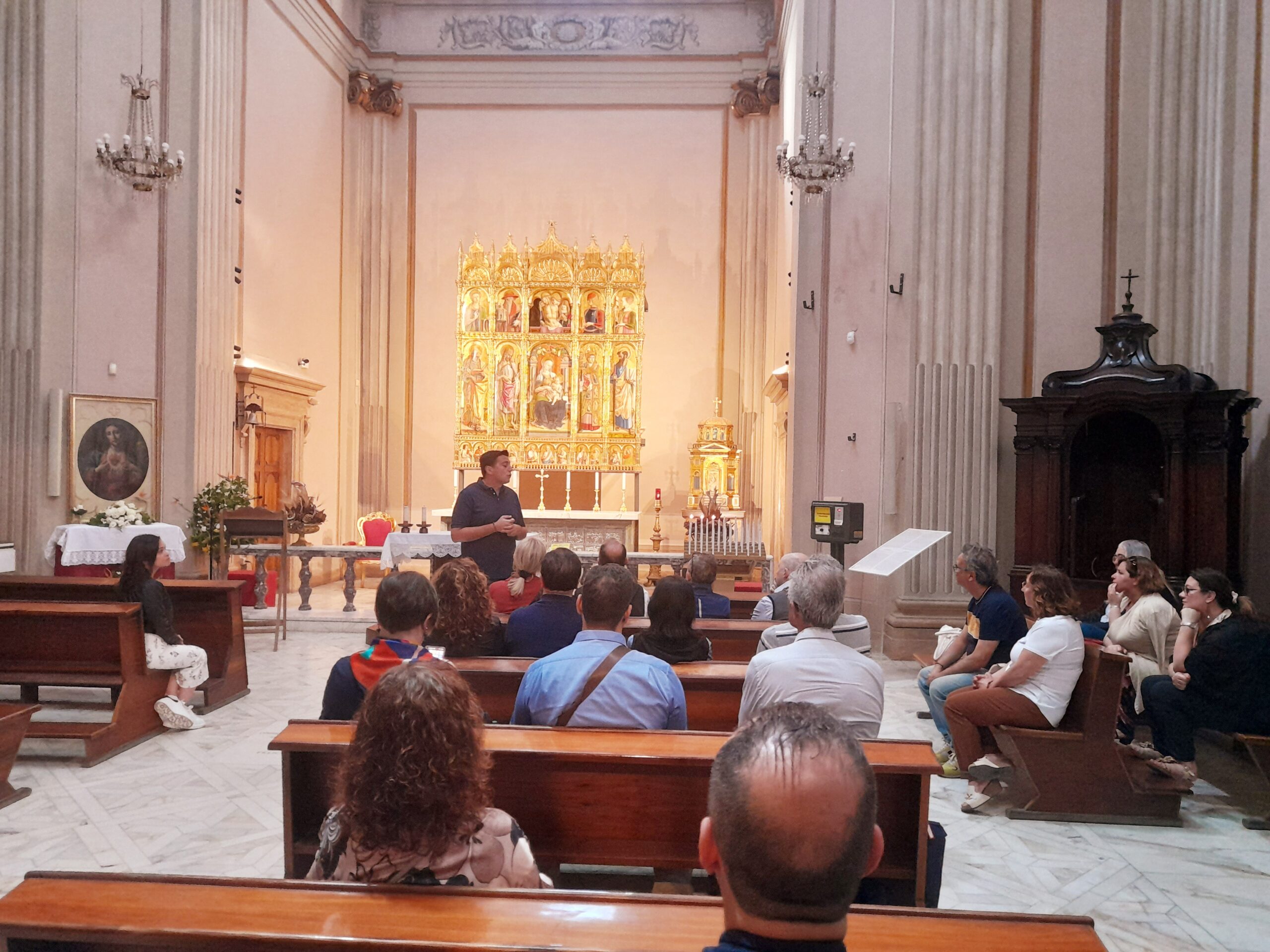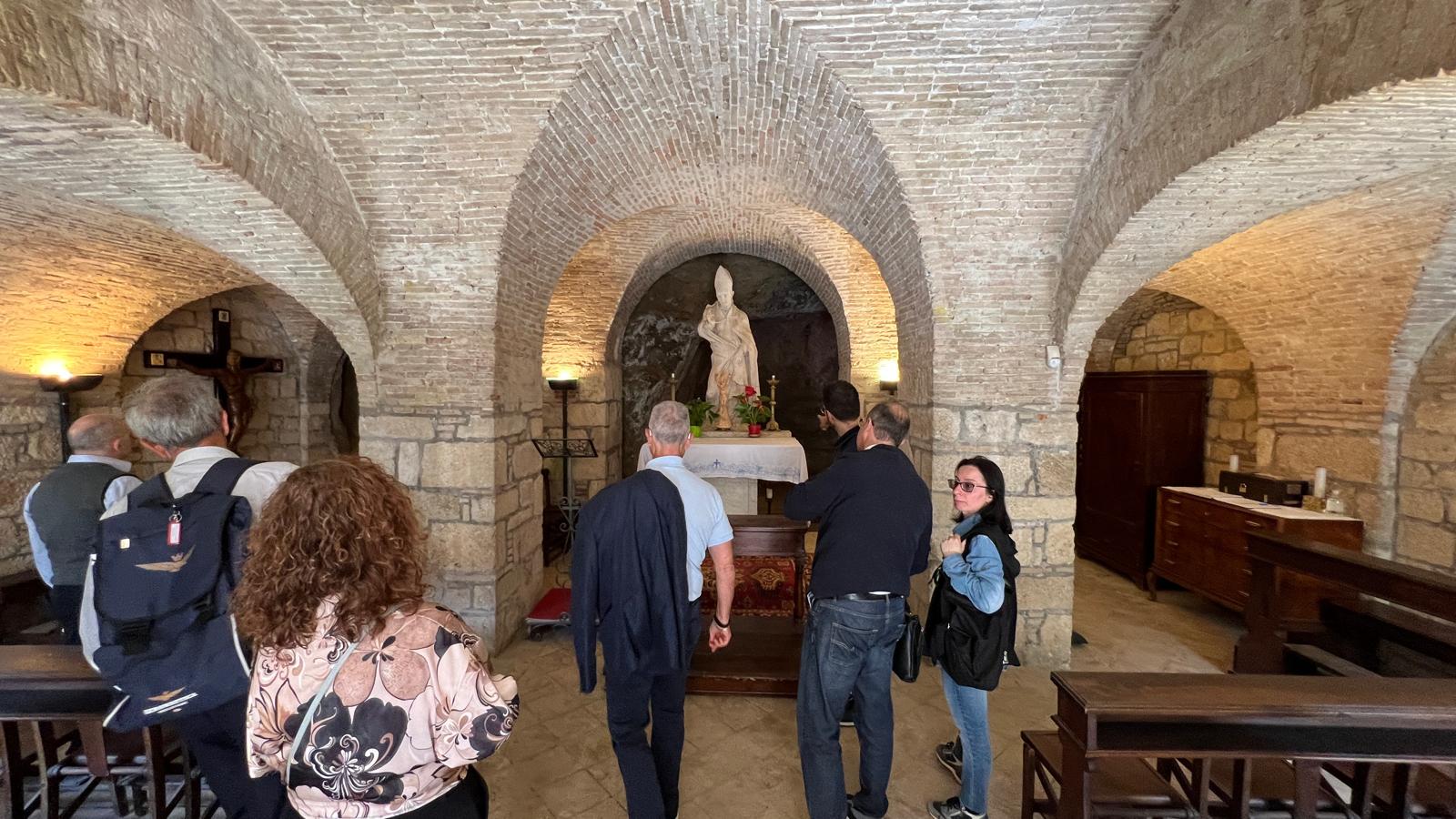 Oltre al Museo, numerosi sono stati i luoghi raggiunti dal gruppo di studenti e docenti. Al mattino i pellegrini hanno visitato il Duomo di Sant’Emidio, sotto la guida sapiente ed esperta del prof. Andrea Viozzi, il quale ha incantato gli studenti, raccontando la genesi, il contesto storico e le caratteristiche delle opere architettoniche, scultoree e pittoriche presenti all’interno dell’edificio sacro: in particolare il polittico di Sant’Emidio dell’artista Carlo Crivelli, il pregevole paliotto in argento che ricopre l’altare, le due tele di Ludovico Trasi, raffiguranti il Battesimo di Polisia e la Decapitazione di Sant’Emidio, tutte opere preziose conservate all’interno della Cappella del Santissimo Sacramento; invece nella cripta, sotto al presbiterio, la tomba di Sant’Emidio, il gruppo marmoreo di Lazzaro Giosafatti raffigurante Sant’Emidio che battezza Polisia, i preziosi mosaici raffiguranti la storia della Chiesa ascolana, gli antichi affreschi risalenti ai sec. XIII e XIV che sono stati scoperti durante i lavori di restauro partiti nel 2019.