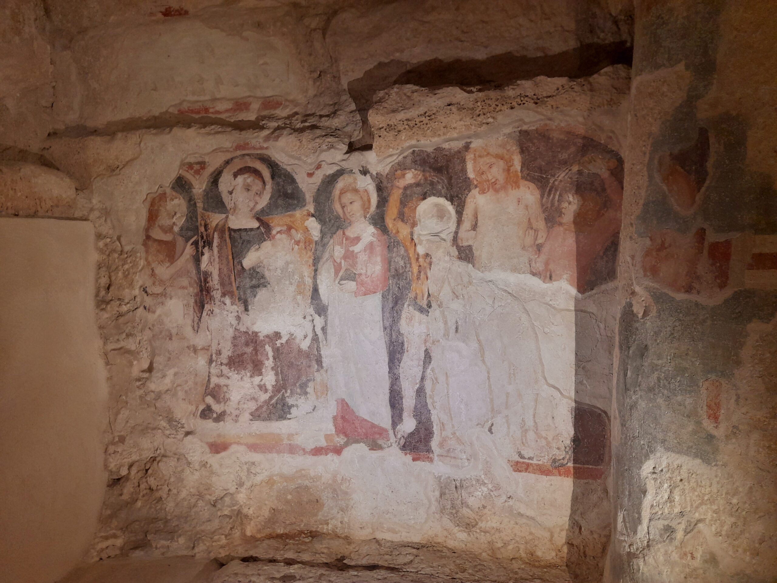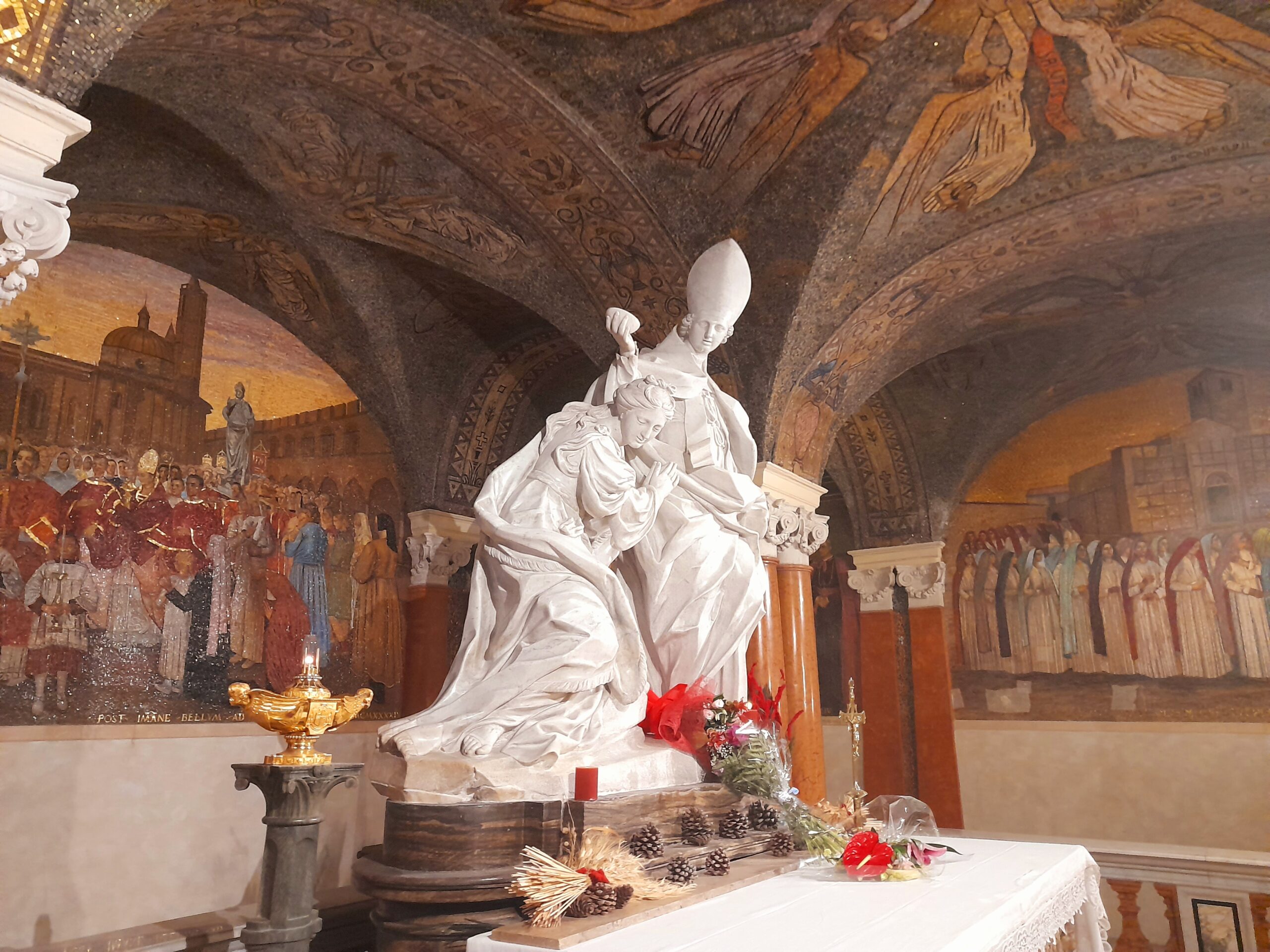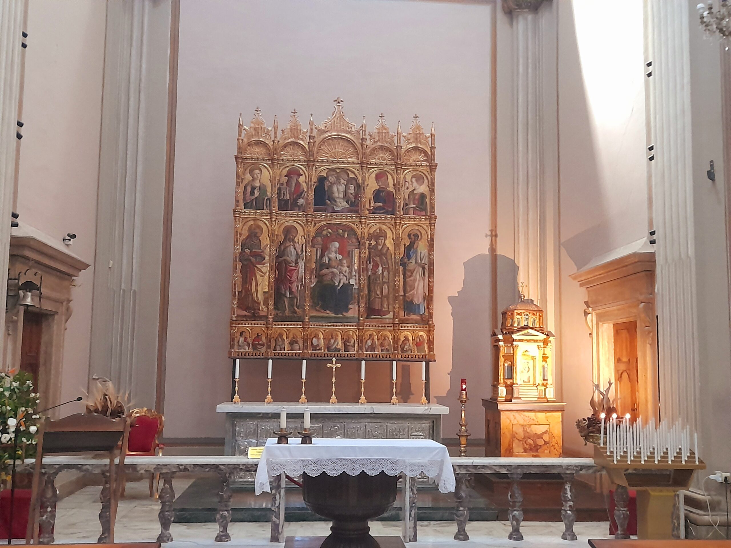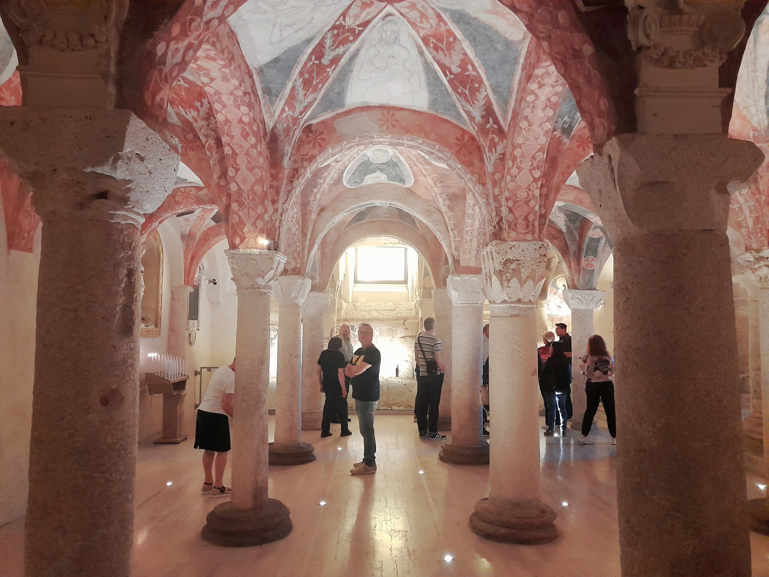 Oltre al Museo, numerosi sono stati i luoghi raggiunti dal gruppo di studenti e docenti. Al mattino i pellegrini hanno visitato il Duomo di Sant’Emidio, sotto la guida sapiente ed esperta del prof. Andrea Viozzi, il quale ha incantato gli studenti, raccontando la genesi, il contesto storico e le caratteristiche delle opere architettoniche, scultoree e pittoriche presenti all’interno dell’edificio sacro: in particolare il polittico di Sant’Emidio dell’artista Carlo Crivelli, il pregevole paliotto in argento che ricopre l’altare, le due tele di Ludovico Trasi, raffiguranti il Battesimo di Polisia e la Decapitazione di Sant’Emidio, tutte opere preziose conservate all’interno della Cappella del Santissimo Sacramento; invece nella cripta, sotto al presbiterio, la tomba di Sant’Emidio, il gruppo marmoreo di Lazzaro Giosafatti raffigurante Sant’Emidio che battezza Polisia, i preziosi mosaici raffiguranti la storia della Chiesa ascolana, gli antichi affreschi risalenti ai sec. XIII e XIV che sono stati scoperti durante i lavori di restauro partiti nel 2019.
