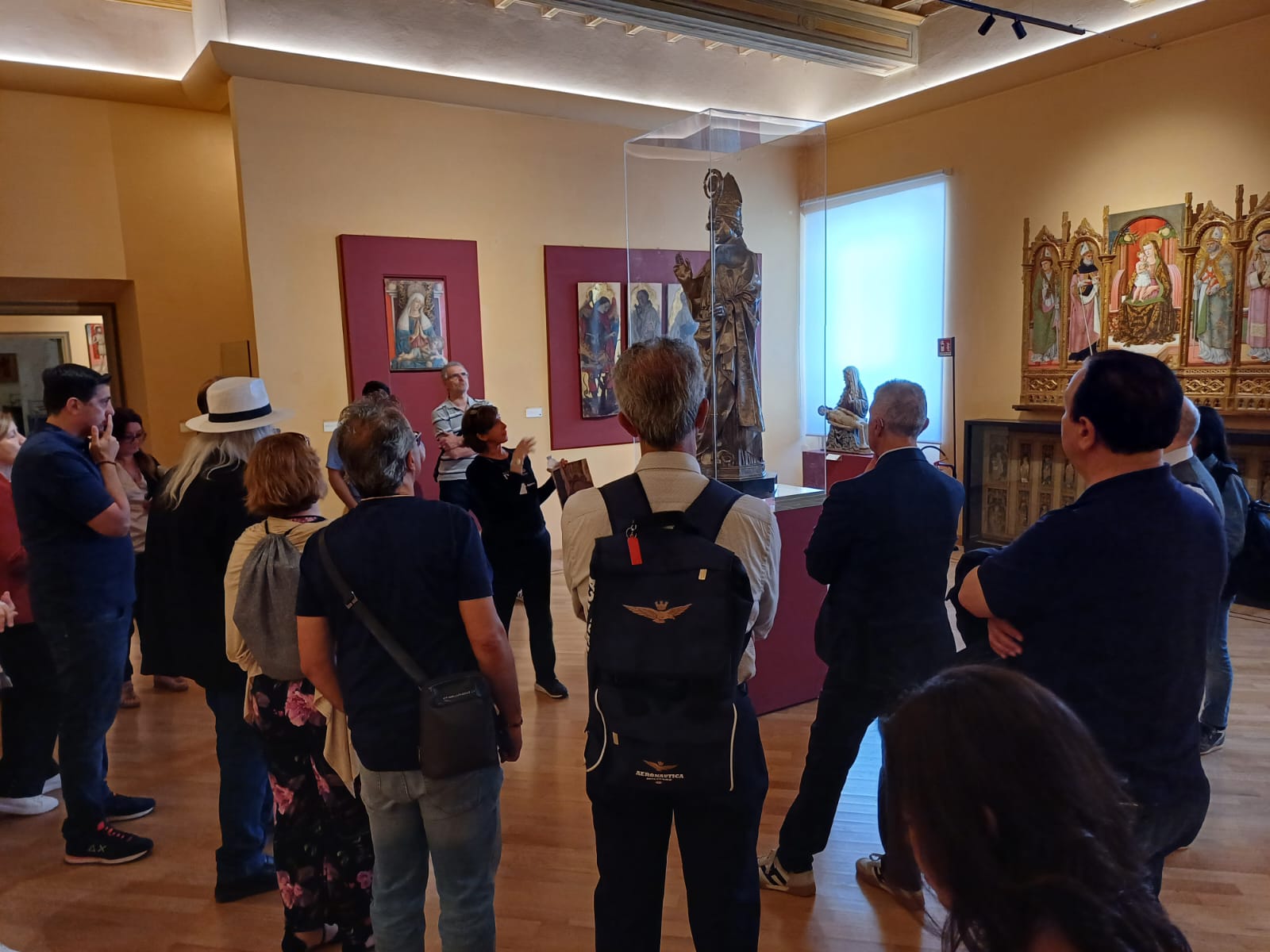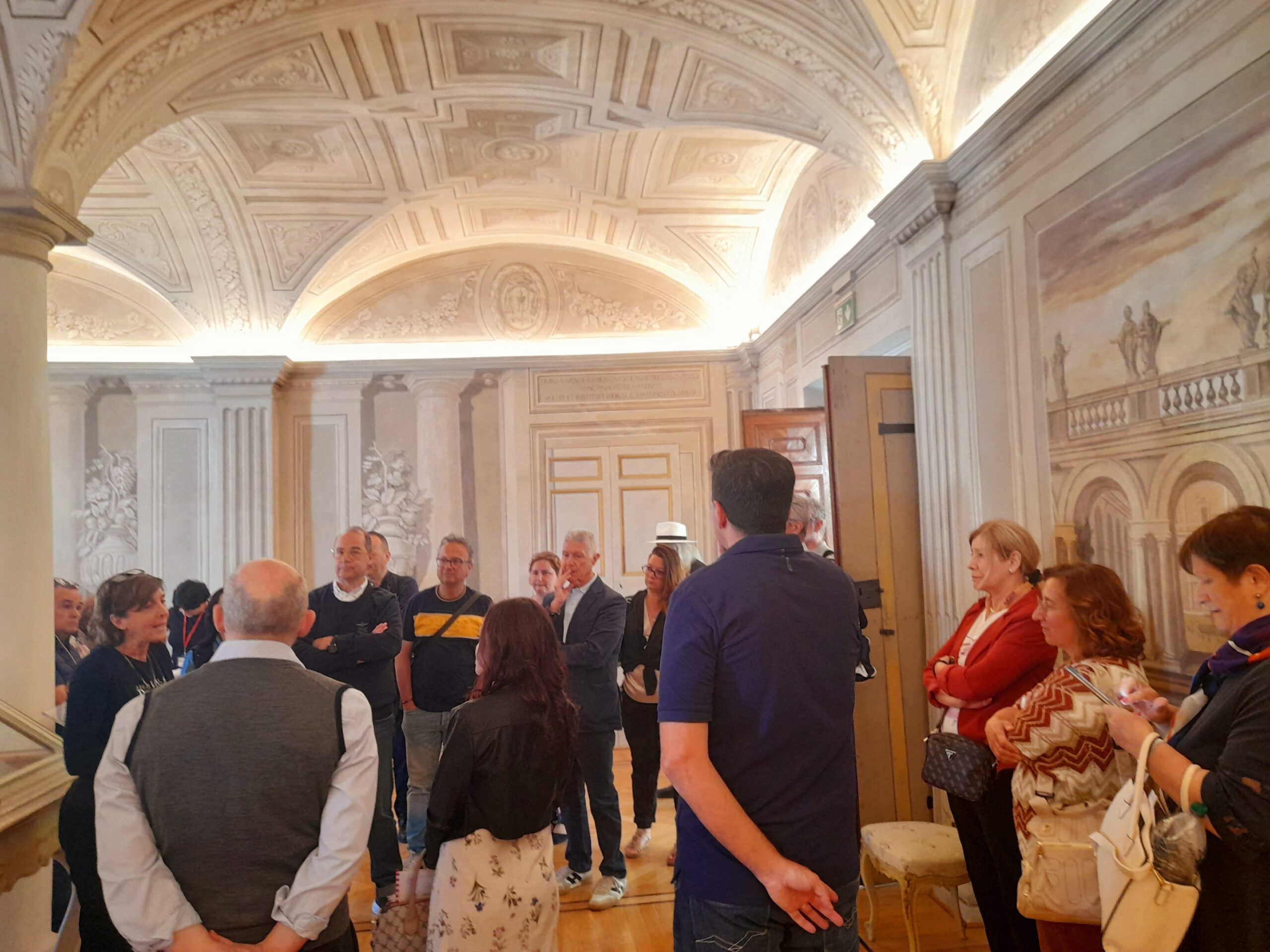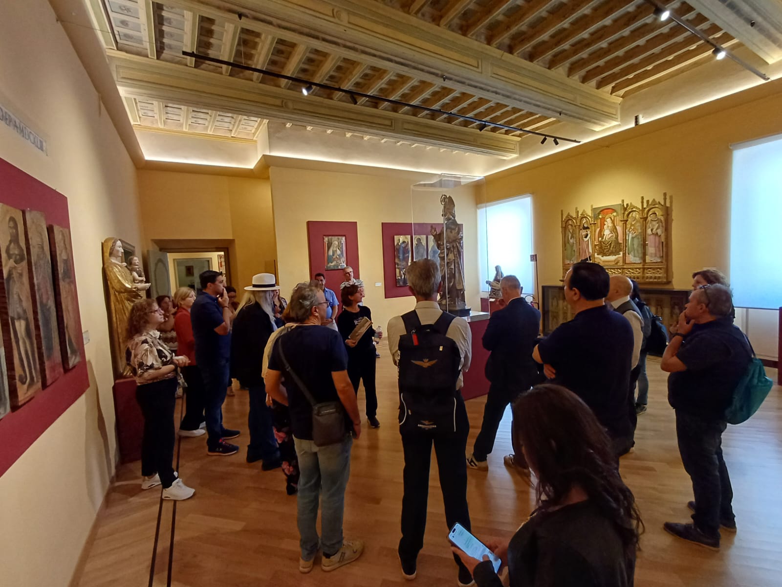 L’incontro è avvenuto alle ore 12:30, al secondo piano di Palazzo Roverella, al termine della visita al Museo Diocesano, ospitato al piano sottostante, dove il gruppo di viaggiatori aveva avuto l’opportunità, durante la mattinata, di ammirare una preziosa raccolta di arte sacra, importante espressione della cultura del territorio ascolano, che comprende preziosi dipinti di Carlo Crivelli, Pietro Alemanno e Cola d’Amatrice, il ciclo di affreschi di Marcello Fogolino raffiguranti episodi della vita di Mosè, la statua di Sant’Emidio di Pietro Vannini, oltre a varie sculture lignee ed in pietra e a frammenti decorativi, arredi ed argenterie sacre, tra i quali anche una croce, donata da papa Niccolò IV, contenente una preziosissima reliquia della Santa Croce.