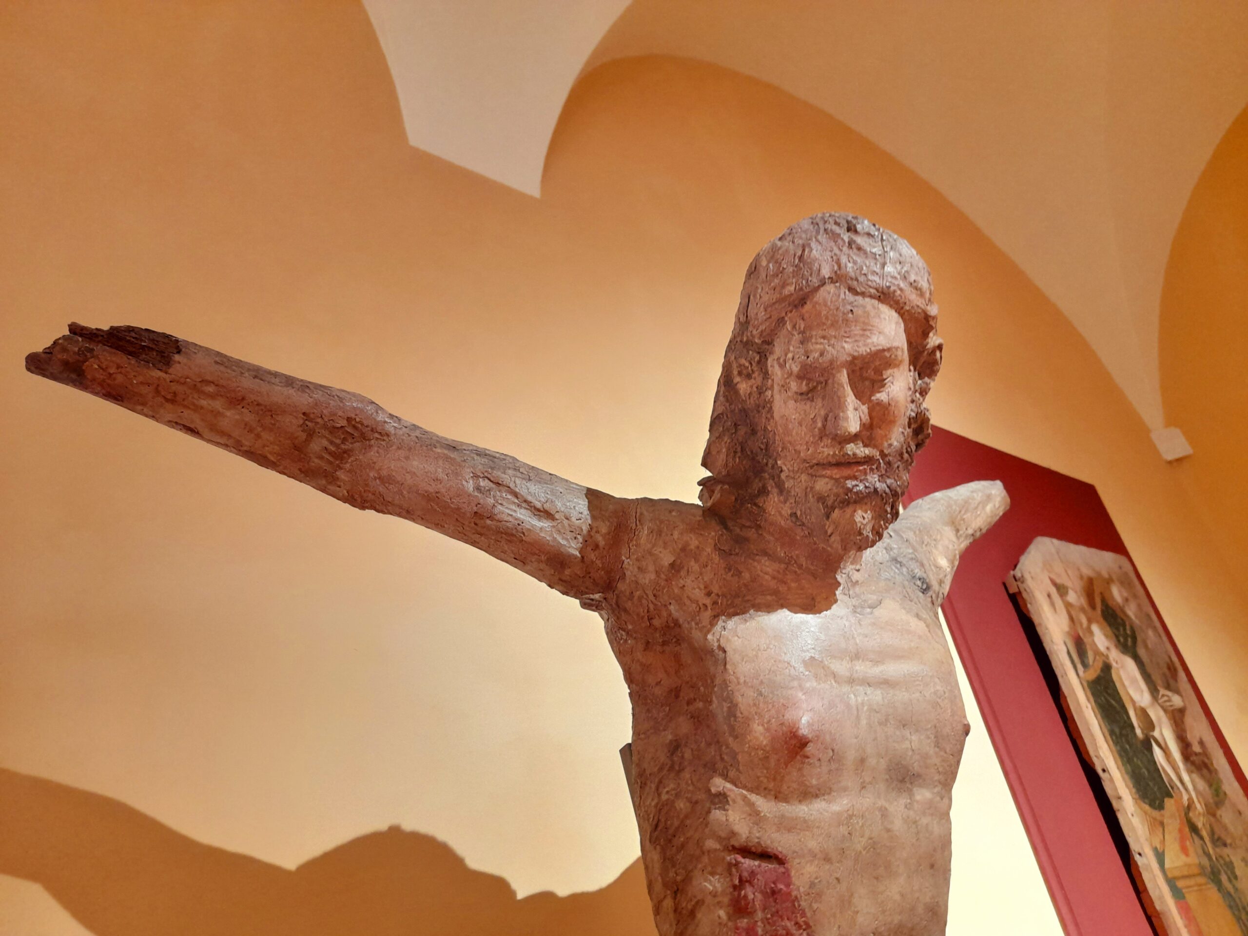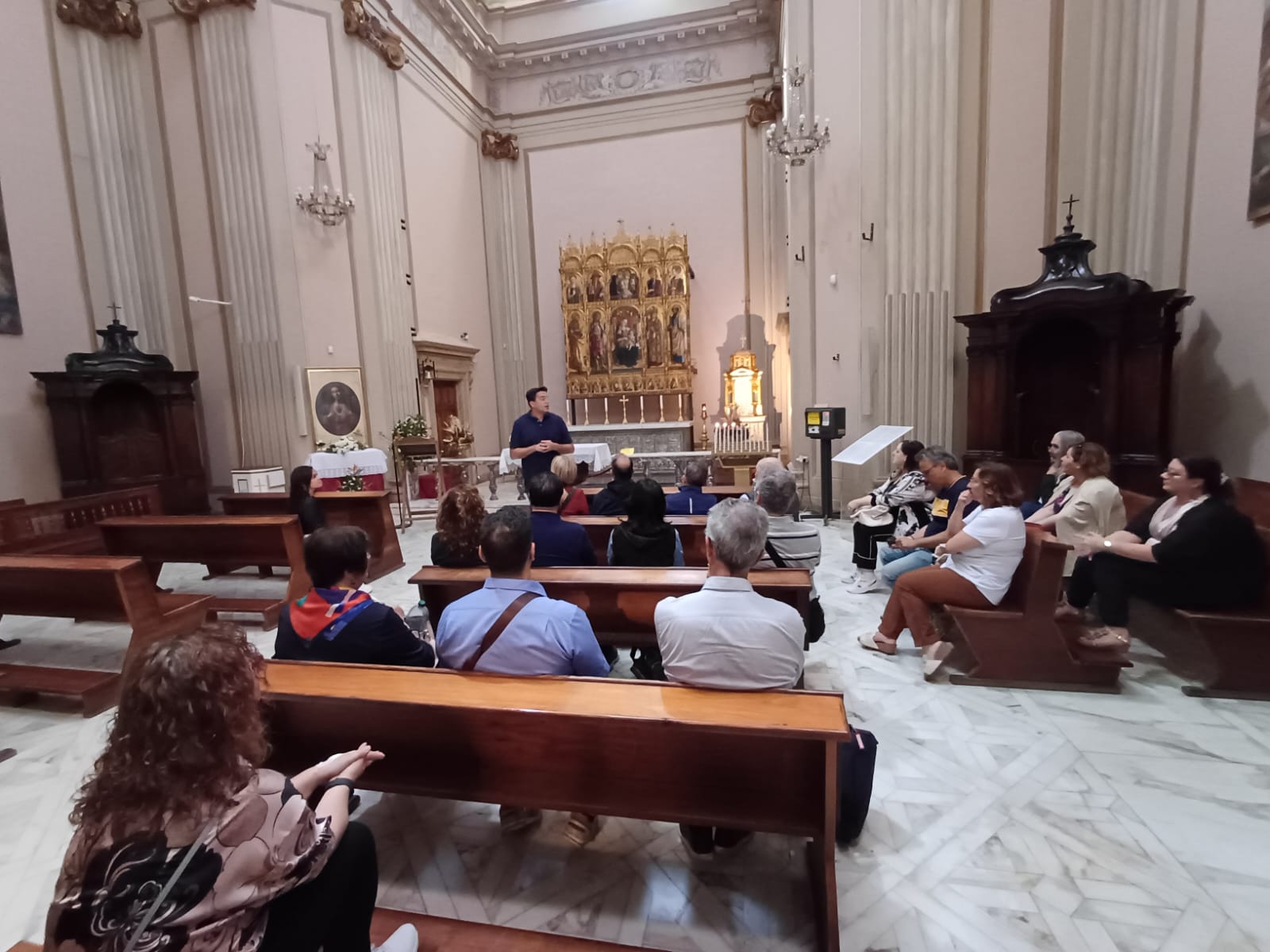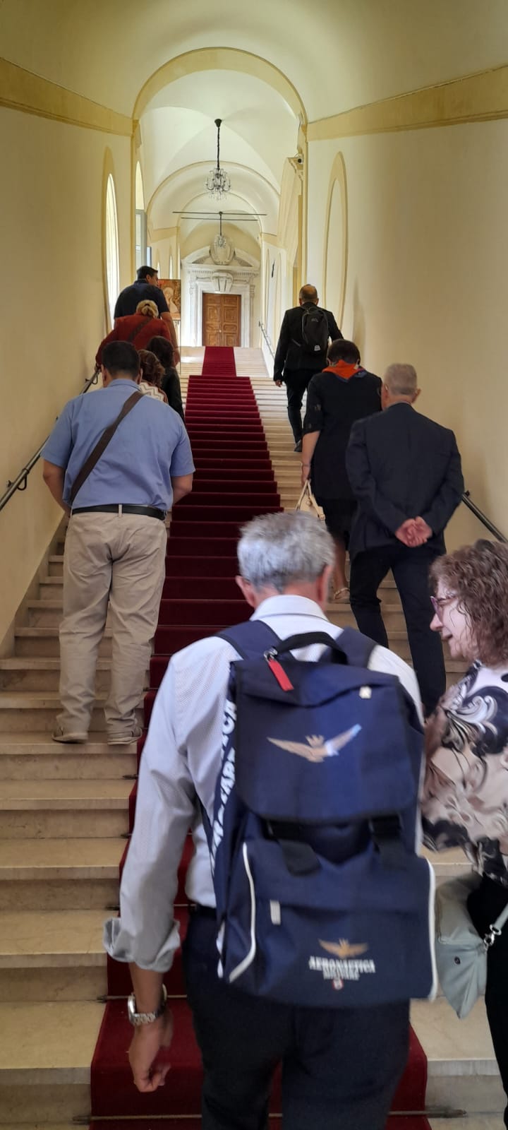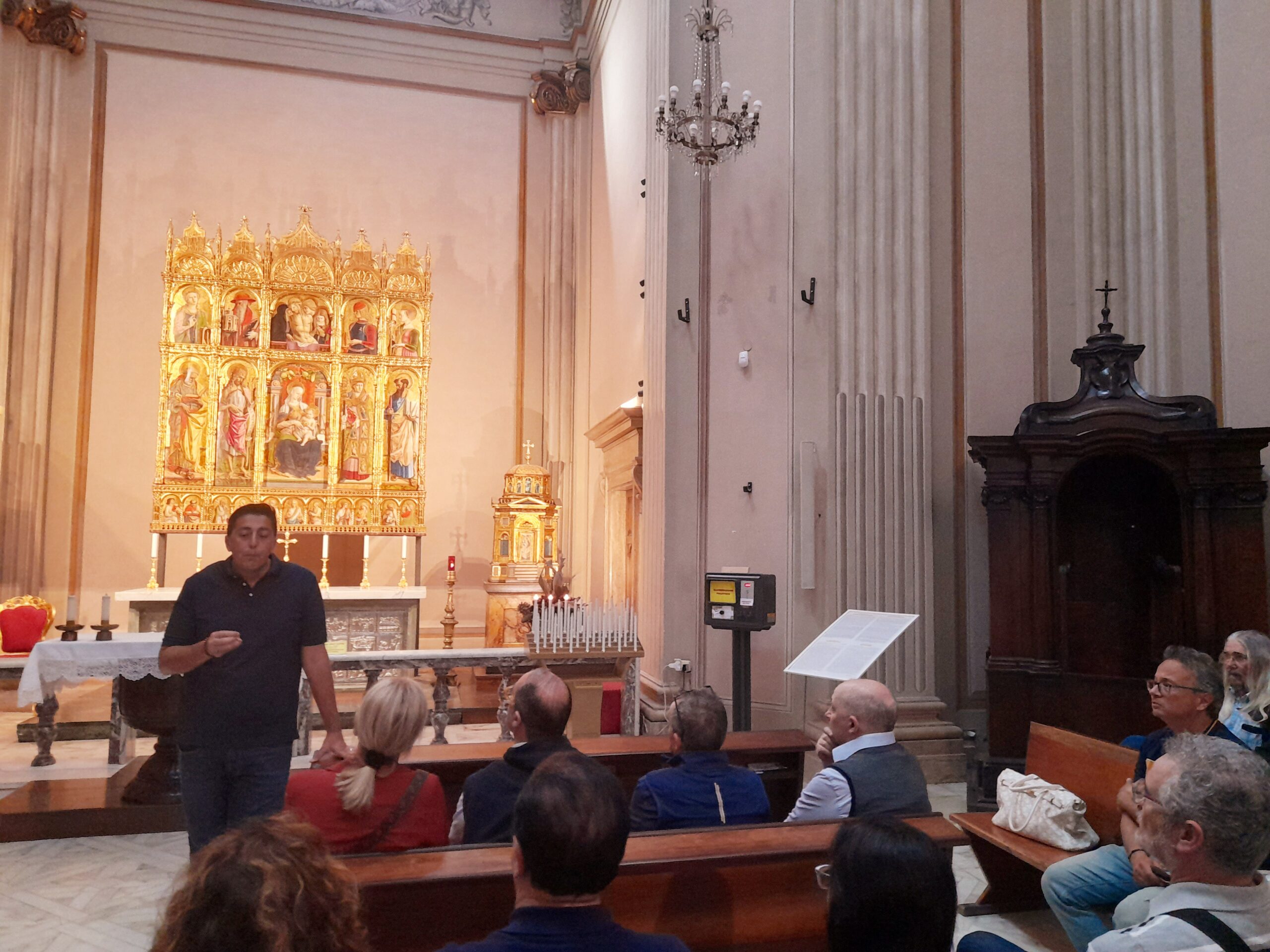 L’incontro è avvenuto alle ore 12:30, al secondo piano di Palazzo Roverella, al termine della visita al Museo Diocesano, ospitato al piano sottostante, dove il gruppo di viaggiatori aveva avuto l’opportunità, durante la mattinata, di ammirare una preziosa raccolta di arte sacra, importante espressione della cultura del territorio ascolano, che comprende preziosi dipinti di Carlo Crivelli, Pietro Alemanno e Cola d’Amatrice, il ciclo di affreschi di Marcello Fogolino raffiguranti episodi della vita di Mosè, la statua di Sant’Emidio di Pietro Vannini, oltre a varie sculture lignee ed in pietra e a frammenti decorativi, arredi ed argenterie sacre, tra i quali anche una croce, donata da papa Niccolò IV, contenente una preziosissima reliquia della Santa Croce.