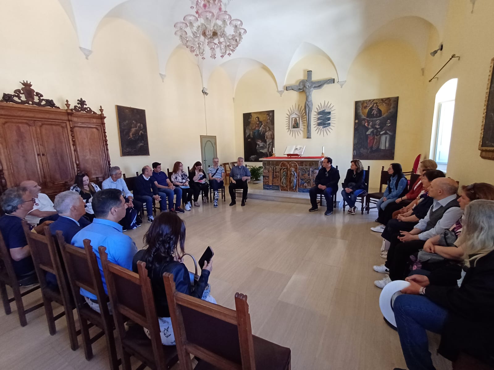 A seguire il vescovo ha spiegato il significato della stanza in cui ha ricevuto il gruppo, la Sala del Discernimento, e ha anche illustrato le opere d’arte presenti al suo interno. Prima di congedarsi, ha invitato tutti i presenti a degli incontri di formazione biblico-spirituali che si terranno in estate, dall’11 al 14 Luglio 2024.