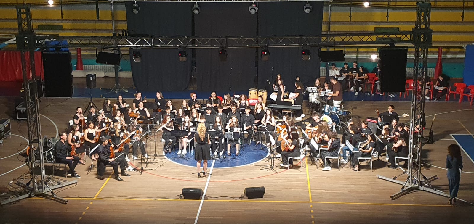 SAN BENEDETTO DEL TRONTO – PalaSpeca gremito per il concerto di fine anno scolastico della maxi orchestra dei ragazzi della scuola “M. Curzi” di San Benedetto. Gli oltre 60 giovani musicisti, affiancati da ex alunni e dal coro composto da studenti, docenti e personale di segreteria, hanno proposto un repertorio che ha spaziato da Vivaldi, Piazzolla fino a toccare i Metallica, passando per grandi classici come “Besame mucho” e l’iconica “We are the world”. Ad aprire il concerto, la sorpresa del messaggio audio inviato dall’attore e doppiatore Luca Ward che, parafrasando la sua celebre battuta nel film “Il Gladiatore”, ha invitato i ragazzi a “scatenare il concerto”.
