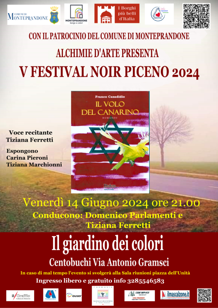 MONTEPRANDONE – Terzo appuntamento per il 5° Festival Noir Piceno 2024 con Franco Casadidio che torna per la seconda volta a Centobuchi, a cura dell’associazione Alchimie d’Arte con il patrocinio del Comune di Monteprandone e la collaborazione di Avis Monteprandone, Auser insieme Monteprandone con gli sponsor Farmacia San Giacomo e Code Service. L’evento si svolgerà venerdì 14 giugno alle ore 21, presso “Il Giardino dei colori” di Via Gramsci a Centobuchi. Franco Casadidio, presenterà la sua opera dal titolo “Il Volo del canarino” (Drakon edizioni).