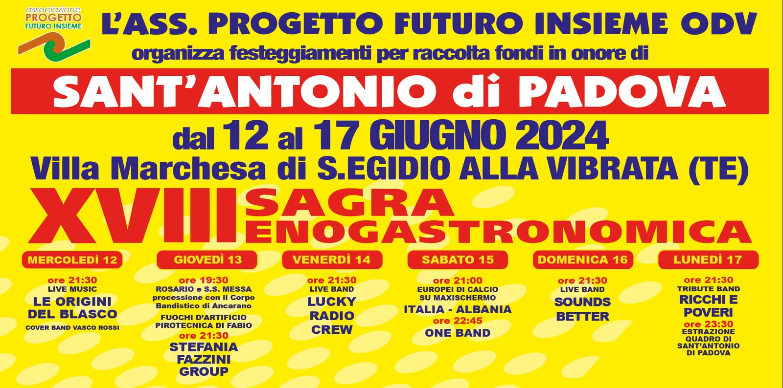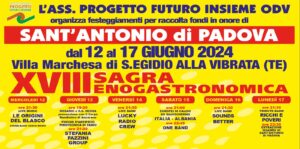 SANT’EGIDIO ALLA VIBRATA – Proseguono i festeggiamenti in onore di Sant’Antonio di Padova, patrono dell’oratorio di Villa Marchesa in Sant’Egidio alla Vibrata. Dopo la Tredicina “Sui passi di Antonio” alla scoperta del senso di comunità, di carità e del bene comune e dopo la proiezione del film “Don Zeno”, da stasera, Mercoledì 12, fino a Lunedì 17 Giugno 2024 si svolgerà la XVIII Sagra Enogastronomica di Villa Marchesa. Il ricavato della festa, organizzata dall’Associazione “Progetto Futuro Insieme” ODV, verrà investito, nel corso dell’anno, in altre iniziative benefiche.