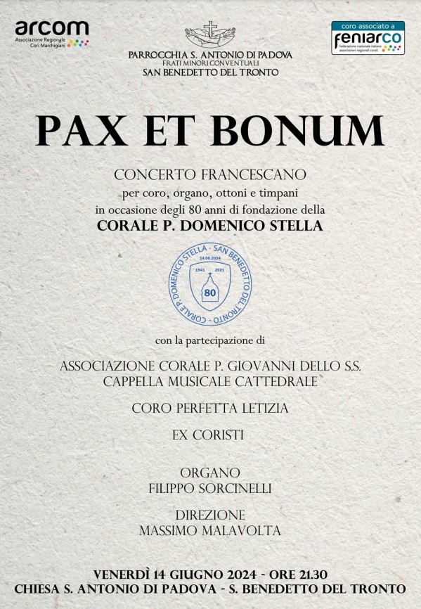 Prenderanno parte la Corale P. Domenico Stella, la Cappella Musicale Cattedrale Associazione Polifonica P. Giovanni dello Spirito Santo, il Coro Perfetta Letizia e gli ex coristi che nel tempo hanno fatto parte prima de “Lu Core de Sant’Antonie” e poi della Corale P. Domenico Stella stessa.