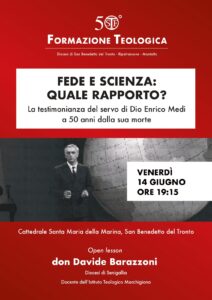 Queste le parole di don Gian Luca Pelliccioni, docente di Teologia Fondamentale presso la Scuola di Formazione Teologica della Diocesi Truentina: “Durante le lezioni di Teologia Fondamentale che la Scuola offre ai suoi studenti, ci siamo più volte interrogati sul rapporto tra fede e ragione, tra fede e scienza, e spesso abbiamo citato il servo di Dio, poi divenuto venerabile, Enrico Medi, un uomo di fede e di scienza, che ha fatto sintesi di queste due dimensioni e può quindi offrire una testimonianza illuminante su come esse siano legate. Occorre oggi valorizzare il rapporto tra fede e ragione come un incontro e non come uno scontro. Nella coscienza di molte persone spesso le due realtà si oppongono e sono quindi in conflitto; la ragione, invece, interviene anche nella nostra fede, anzi la conduce ad essa e la valorizza. Abbiamo allora pensato di invitare don Davide Barazzoni, che ha scritto la sua tesi di dottorato proprio su Enrico Medi ed è quindi un esperto del suo pensiero e del suo agire. Colgo l’occasione per ringraziarlo, a nome della Scuola di Formazione Teologica, per la sua disponibilità, grazie alla quale potremo approfondire un tema interessante che interroga le coscienze di molti”.