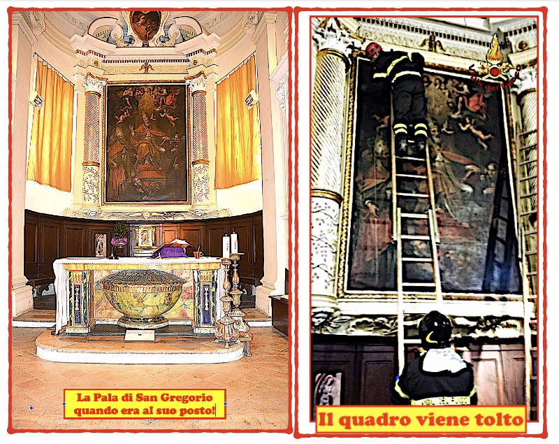 E non tarderà sicuramente ad essere qui riposizionato, dietro all’altare maggiore,  (dopo il termine dei lavori) il quadro raffigurante San Gregorio Magno che fu rimosso e prelevato dai Vigili del Fuoco per questioni di sicurezza e che, dopo aver fatto bella mostra di sé nel “Palazzo Campana di Osimo” durante la mostra “I Capolavori Dei Sibillini- L’arte dei luoghi feriti dal sisma”, fu riportato in paese e messo in una parete all’interno della Chiesa dei Santi Pietro e Silvestro! Qui trovò rifugio anche la Statua Lignea di “San Giuseppe con Bambino” che era anch’essa in San Gregorio e che qui tornerà!