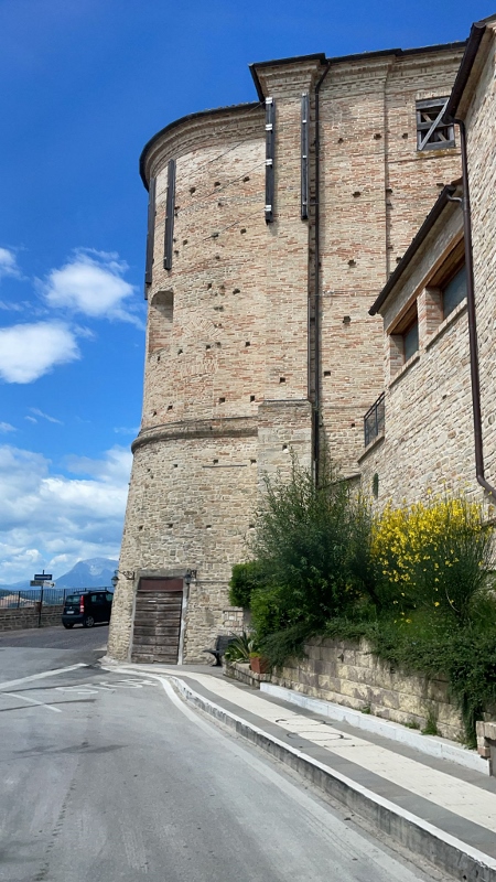 Il portale in pietra con timpano spezzato reca in alto al centro lo stemma del Cardinale. Molto suggestivo ed imponente l’abside che si eleva sopra, quasi continuandolo, al cosiddetto “Murello”, da sempre luogo di incontro dei Montelparesi. Un piccolo campanile a vela con tre campane si erge a fianco della Porta del Sole. Nel 1745, a causa di un incendio doloso, l’edificio sacro subì gravi danni, ma soprattutto fu distrutta la teca che custodiva il cuore del Petrocchini oltre a reliquie insigni, paramenti, cappella vescovile, vasi sacri e preziosi candelieri d’argento!
