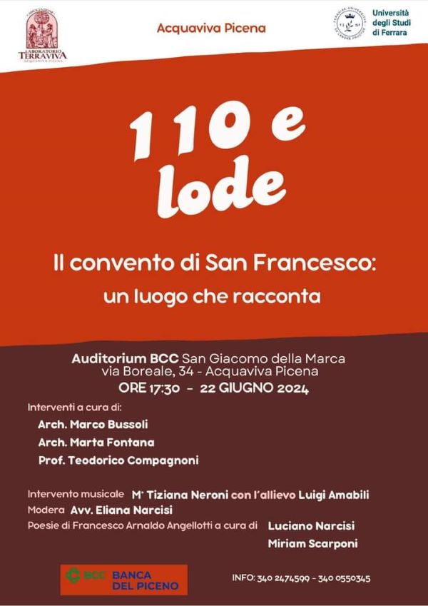 ACQUAVIVA PICENA – Presso l’Auditorium della BCC “San Giacomo della Marca”, in via Boreale 34, di Acquaviva Picena, sabato 22 giugno si terrà il secondo appuntamento promosso dall’Associazione “Laboratorio Terraviva”, che avrà come tema il convento di San Francesco di Acquaviva Picena: “Il convento di san Francesco: un luogo che racconta”.