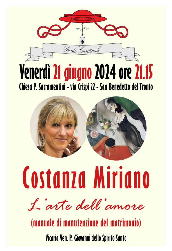 SAN BENEDETTO DEL TRONTO – “La grande notizia è che stasera sarà presente a San Benedetto del Tronto Costanza Miriano, alle 21.15 nella Chiesa dei P. Sacramentini”. Si apre con queste parole la nota di Padre Roberto Brunelli che ci ricorda l’appuntamento di questa sera con la scrittrice e giornalista Costanza Miriano.