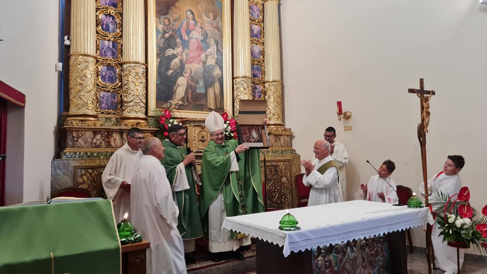 Nel messaggio letto al Vescovo sono stati ripercorsi i suoi 10 anni al servizio della nostra Diocesi e le varie occasioni di incontro che Egli ha avuto con la Comunità partendo dalla prima occasione, a poche settimane dal suo arrivo in Diocesi, in cui il Vescovo venne a benedire la Colonna votiva a Cristo Redentore, posta di fronte alla nostra Chiesa Parrocchiale, e il nostro rinnovato Salone Parrocchiale “Don Ubaldo Grossi”, dopo i lavori voluti dalla Famiglia Carboni in memoria del nostro caro Luca, fino alle varie occasioni di incontro per le annuali Feste Parrocchiali in onore della Madonna di Fatima, in cui il Vescovo ha sempre invitato la Comunità a prendere esempio da Maria, donna dell’ascolto della Parola di Dio, che ci ricorda che dobbiamo, anche noi, metterci in ascolto della Parola di Dio e mettere in pratica ciò che Lui ci ha insegnato.
