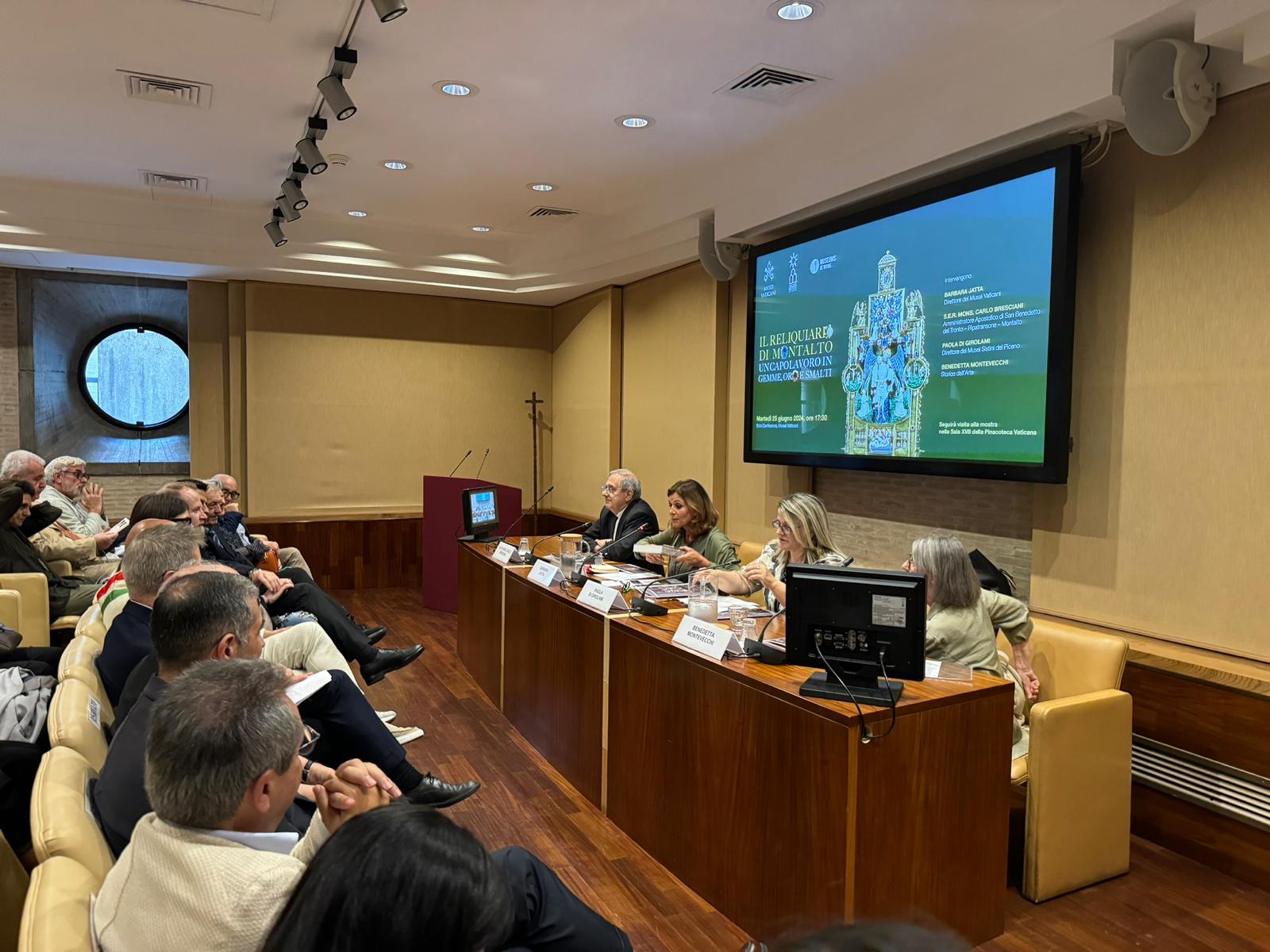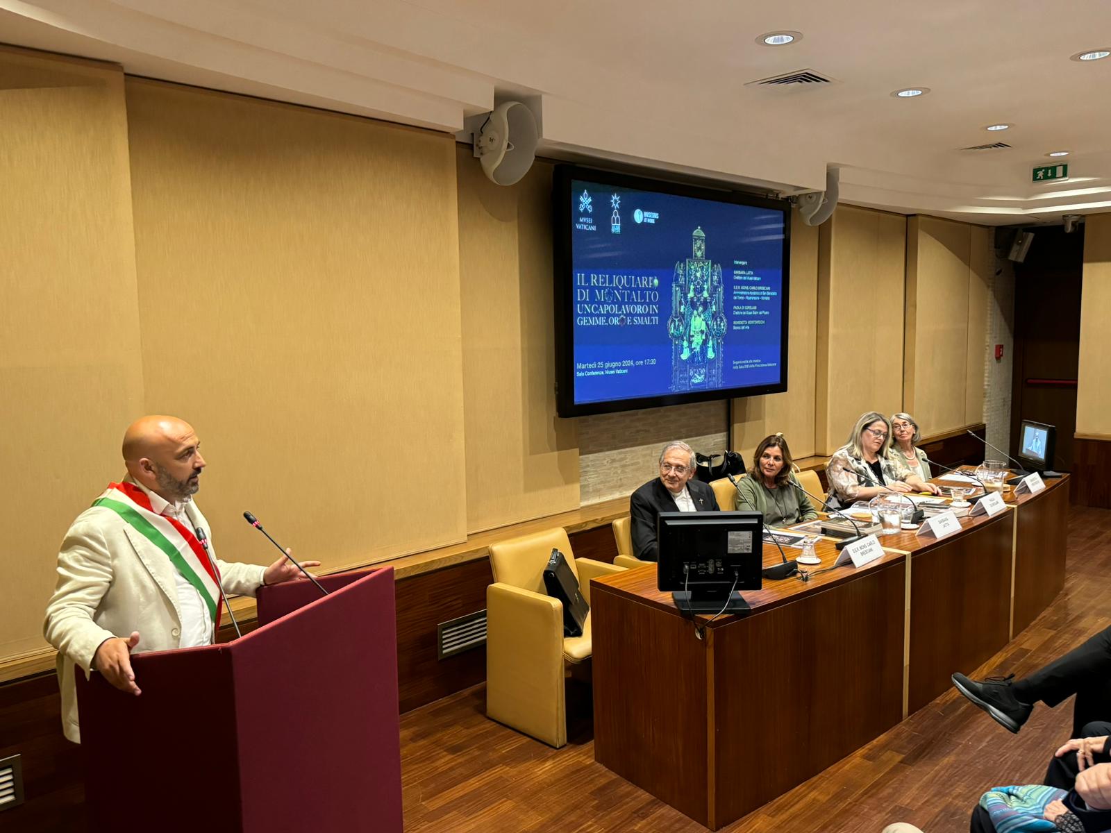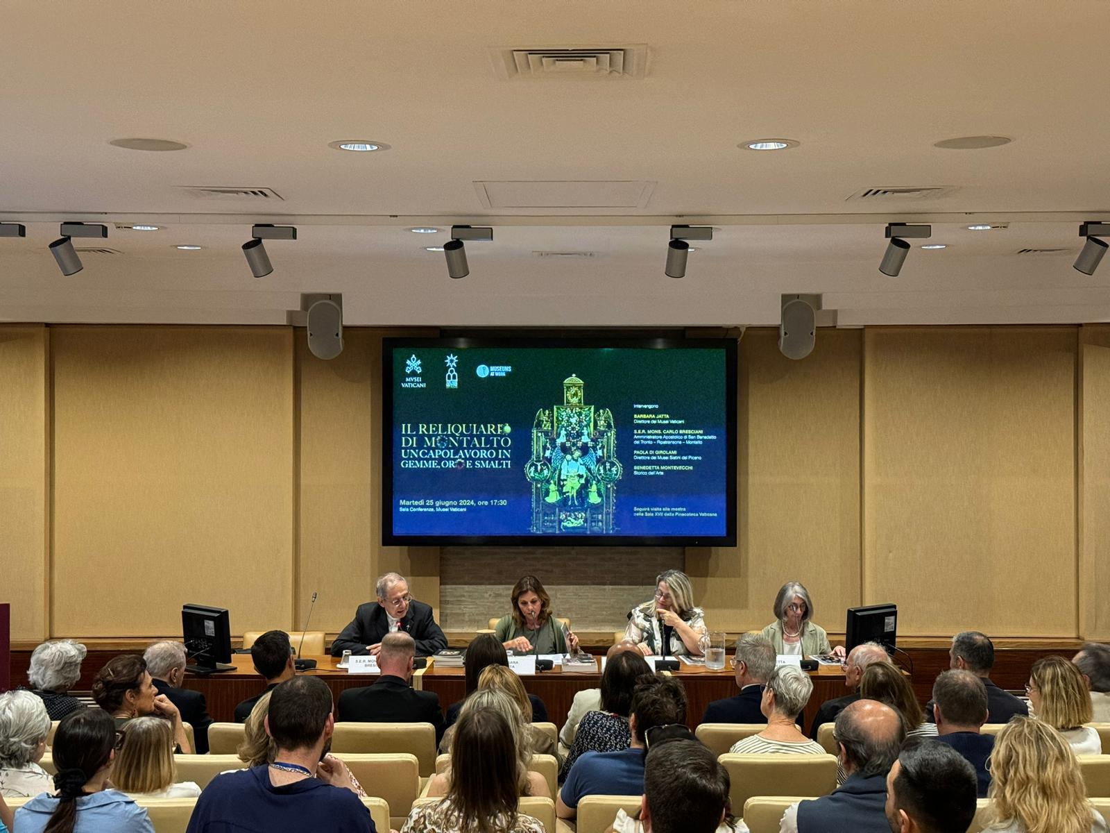 ROMA – Martedì 25 giugno 2024, presso i Musei Vaticani, è stato presentato il Reliquiario di Montalto delle Marche. Si tratta di un vero e proprio capolavoro dell’oreficeria gotica e rinascimentale, realizzato nel XIV secolo, passato dai Valois, agli Asburgo, agli Este, diventando un pregiato elemento del tesoro pontificio fino a giungere nel nostro territorio nel 1586. Sarà esposto per tutta la stagione estiva nella Sala XVII della Pinacoteca Vaticana.