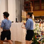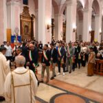 Il vescovo Palmieri ha poi compiuto proseguito il rito d’ingresso con alcuni gesti significativi: il bacio al Crocifisso, l’aspersione dei fedeli con l’acqua santa e un momento di adorazione davanti al tabernacolo. Mons. Gianpiero ha poi indossato i paramenti liturgici e ha portato processionalmente le insegne proprie del suo ministero, ricordando che egli, come il Signore Gesù, viene in mezzo alla sua gente per servire (la stola, che richiama il gesto dell’ultima cena), per insegnare e collaborare con ciascun credente a costruire il Regno (la croce pettorale, che richiama il kerigma fondamentale), per vivere pienamente la relazione con la Chiesa (l’anello, che richiama l’amore sponsale e fedele), per invitare tutti alla santità di vita (la mitria, che richiama il fulgore di una vita spirituale autentica) e per condurre tutti all’incontro con Dio (il pastorale, che richiama il bastone dei patriarchi e dei profeti, nell’unica storia della salvezza, di cui anche noi siamo parte).
