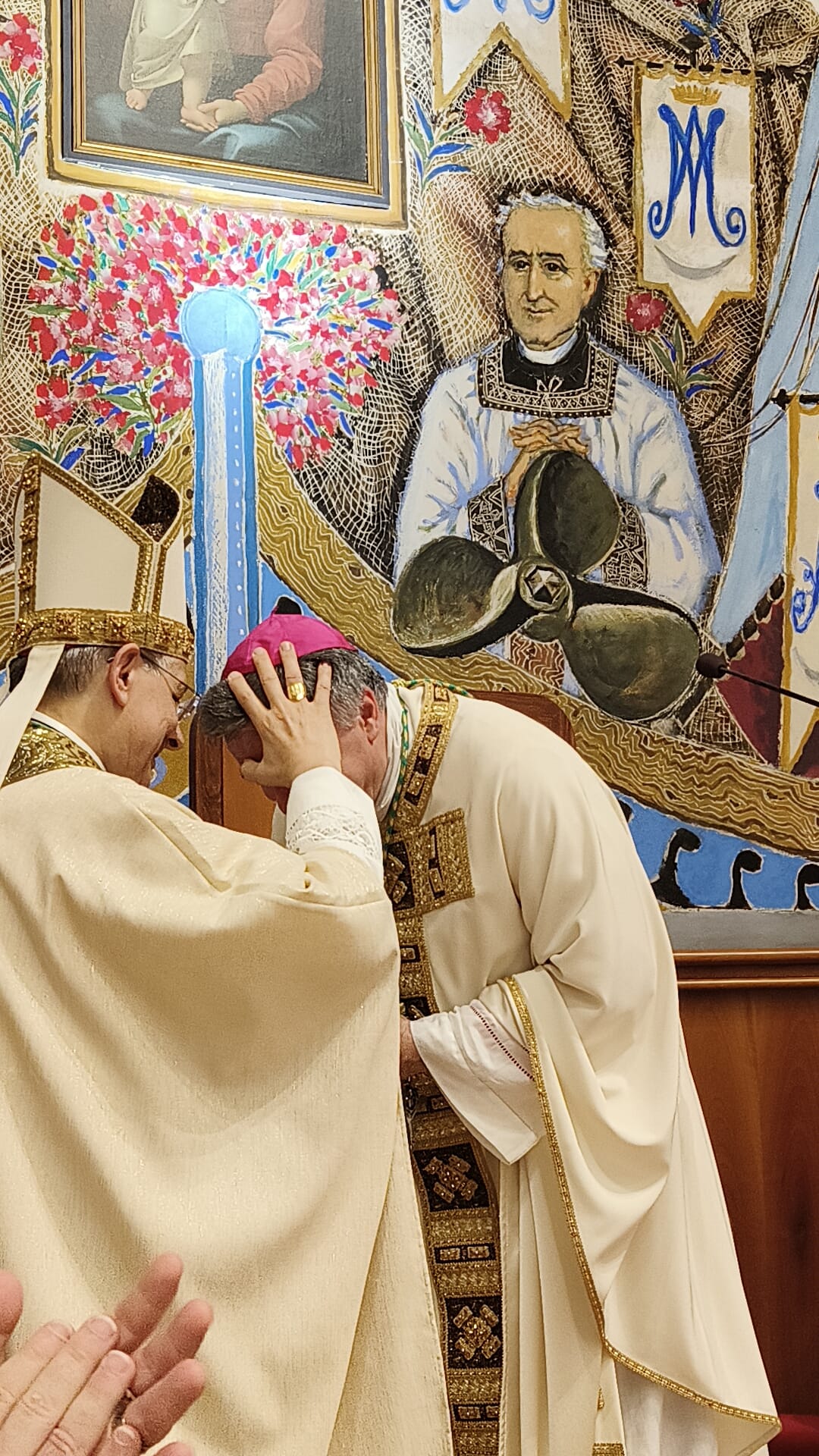 Dopo i riti di Comunione, il vescovo Gianpiero ha voluto ringraziare i numerosi presenti, a partire dalla madre e ha ricordato un gesto che il padre faceva prima di metterlo a letto, ovvero un bacio sulla fronte, segno della benedizione di Dio: “Tutti abbiamo bisogno della benedizione. Oggi ne ho ricevute tante, ma ne manca ancora una molto importante, quella del vescovo Carlo”. Il vescovo emerito Carlo Bresciani ha allora benedetto il suo successore, oltre che con il segno della croce sulla fronte, anche con un abbraccio che ha commosso molti fedeli i quali gli hanno tributato un lungo applauso, colmo di gratitudine per i suoi dieci anni di servizio episcopale. Mons. Gianpiero ha poi ricambiato il dono ricevuto dal vescovo Carlo con un’icona di San Giuseppe, immagine simbolo della paternità.