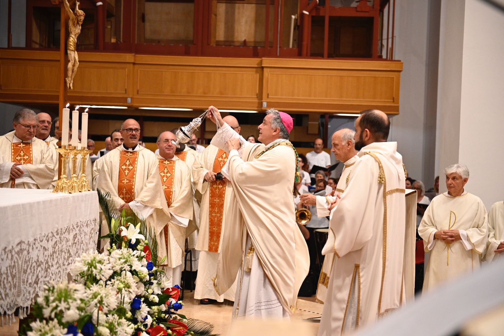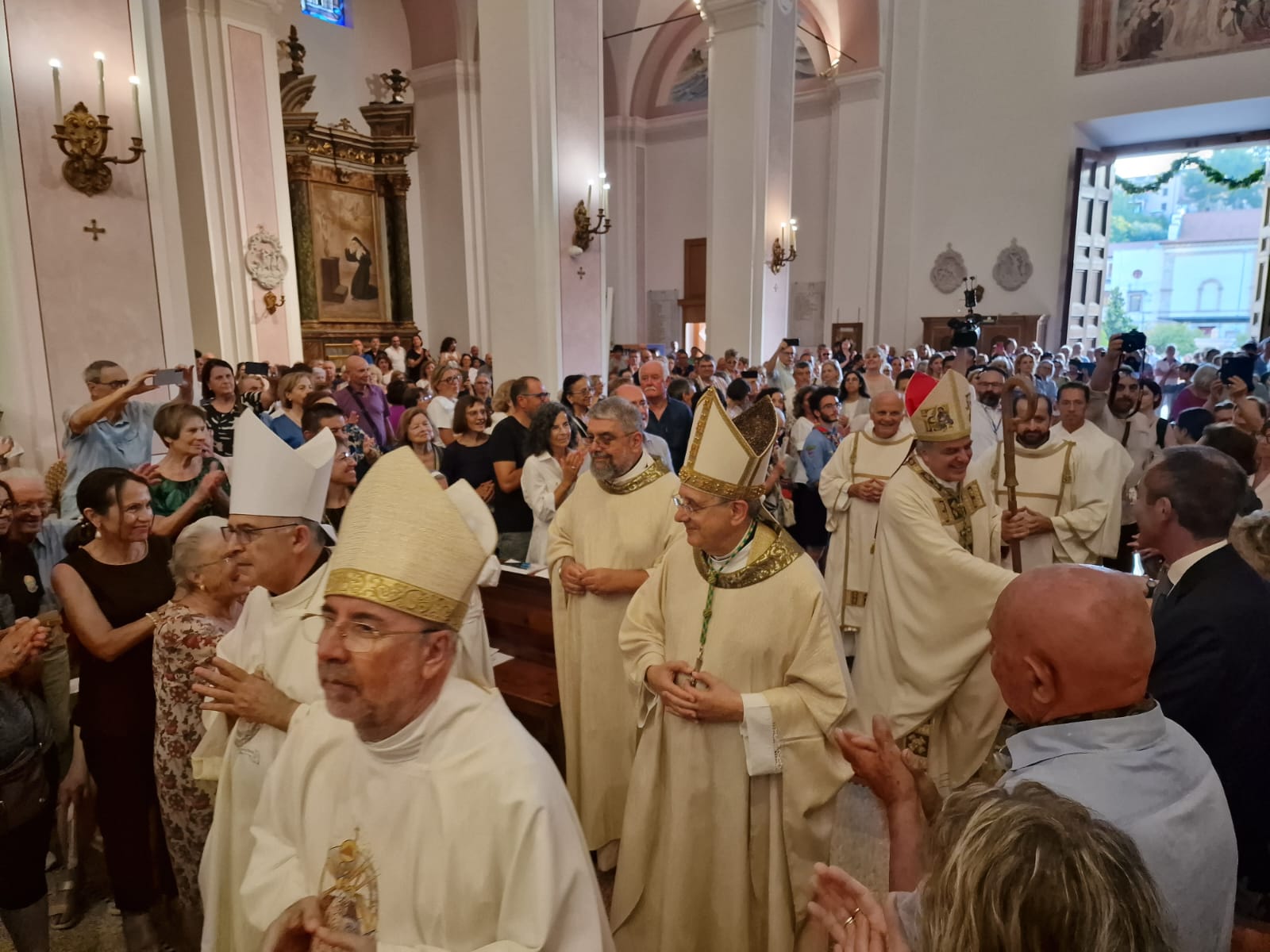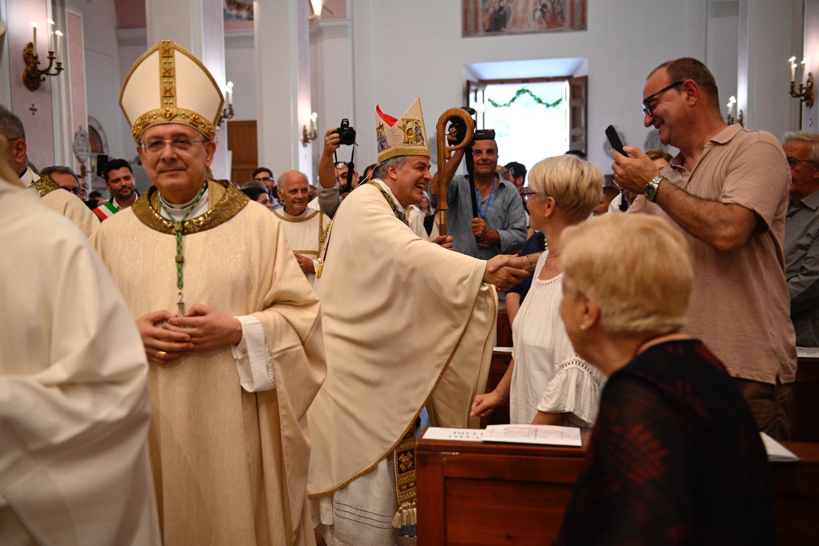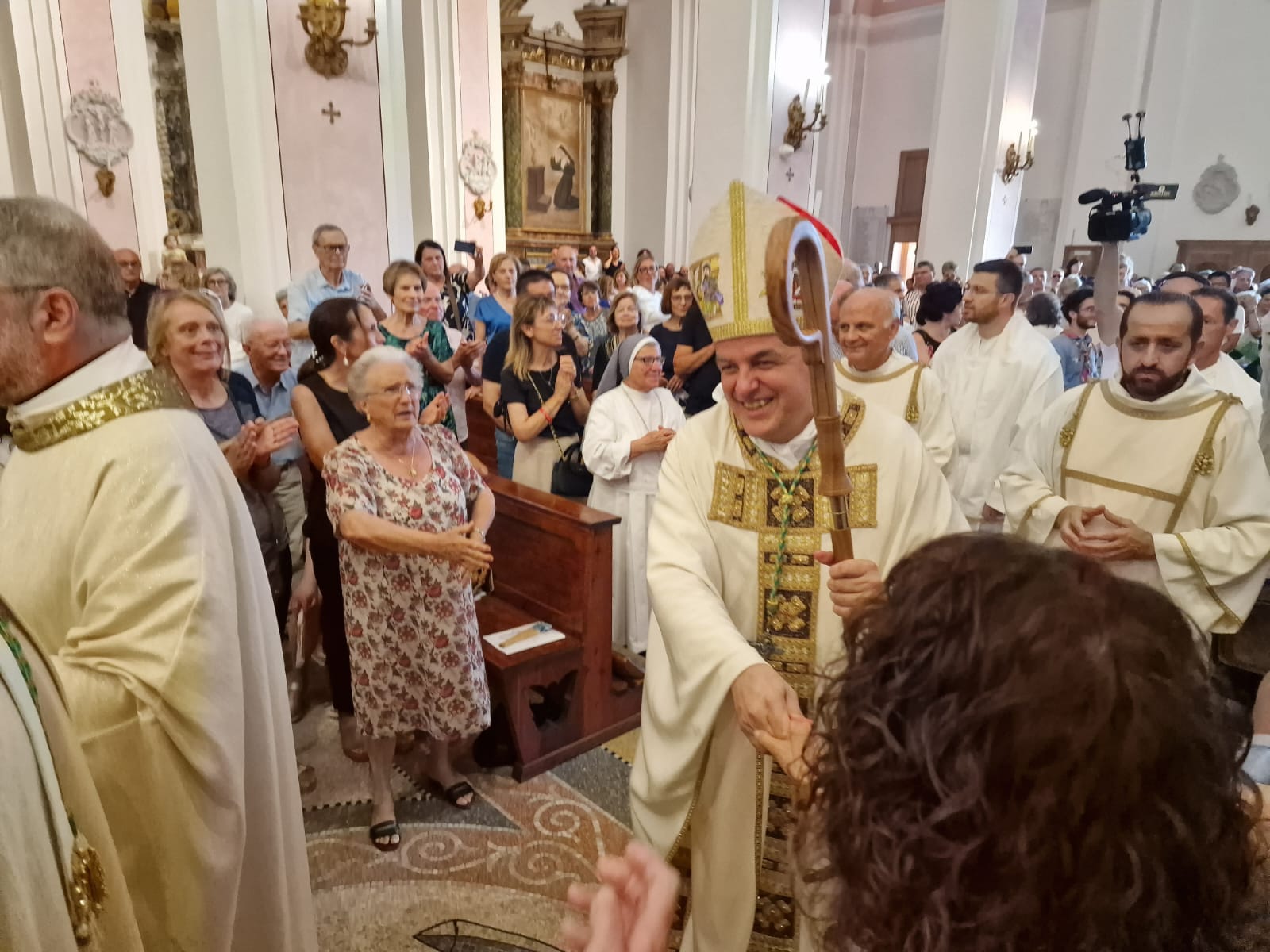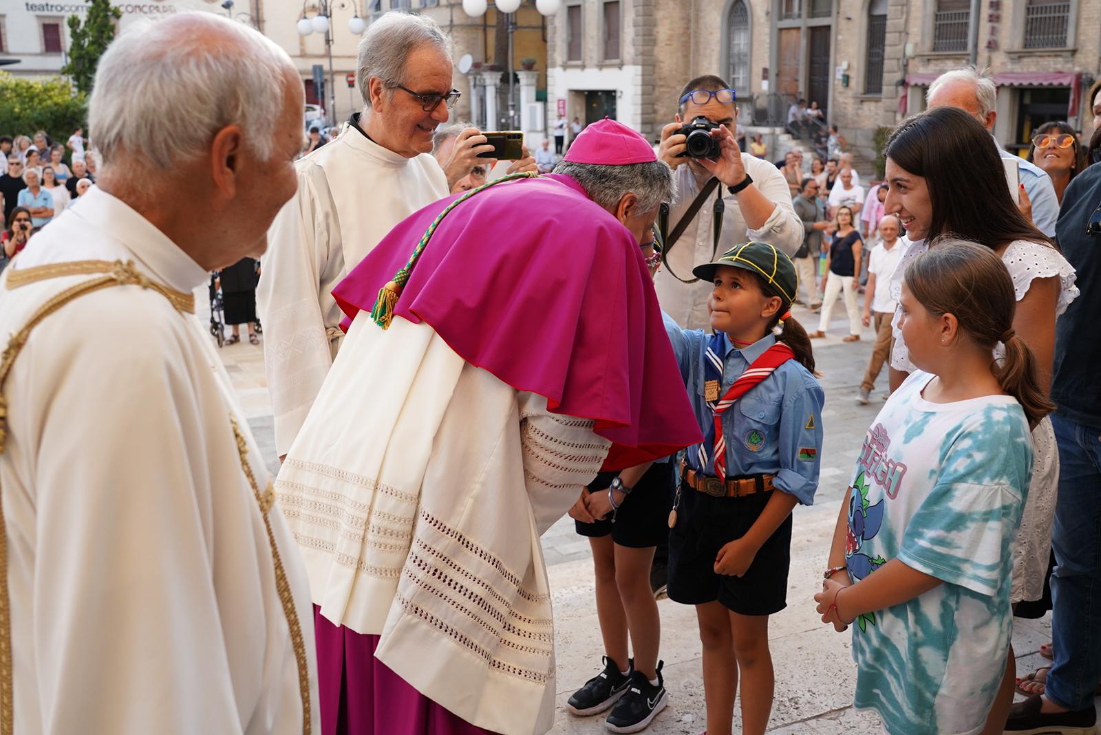 Il vescovo Palmieri ha poi compiuto proseguito il rito d’ingresso con alcuni gesti significativi: il bacio al Crocifisso, l’aspersione dei fedeli con l’acqua santa e un momento di adorazione davanti al tabernacolo. Mons. Gianpiero ha poi indossato i paramenti liturgici e ha portato processionalmente le insegne proprie del suo ministero, ricordando che egli, come il Signore Gesù, viene in mezzo alla sua gente per servire (la stola, che richiama il gesto dell’ultima cena), per insegnare e collaborare con ciascun credente a costruire il Regno (la croce pettorale, che richiama il kerigma fondamentale), per vivere pienamente la relazione con la Chiesa (l’anello, che richiama l’amore sponsale e fedele), per invitare tutti alla santità di vita (la mitria, che richiama il fulgore di una vita spirituale autentica) e per condurre tutti all’incontro con Dio (il pastorale, che richiama il bastone dei patriarchi e dei profeti, nell’unica storia della salvezza, di cui anche noi siamo parte).
