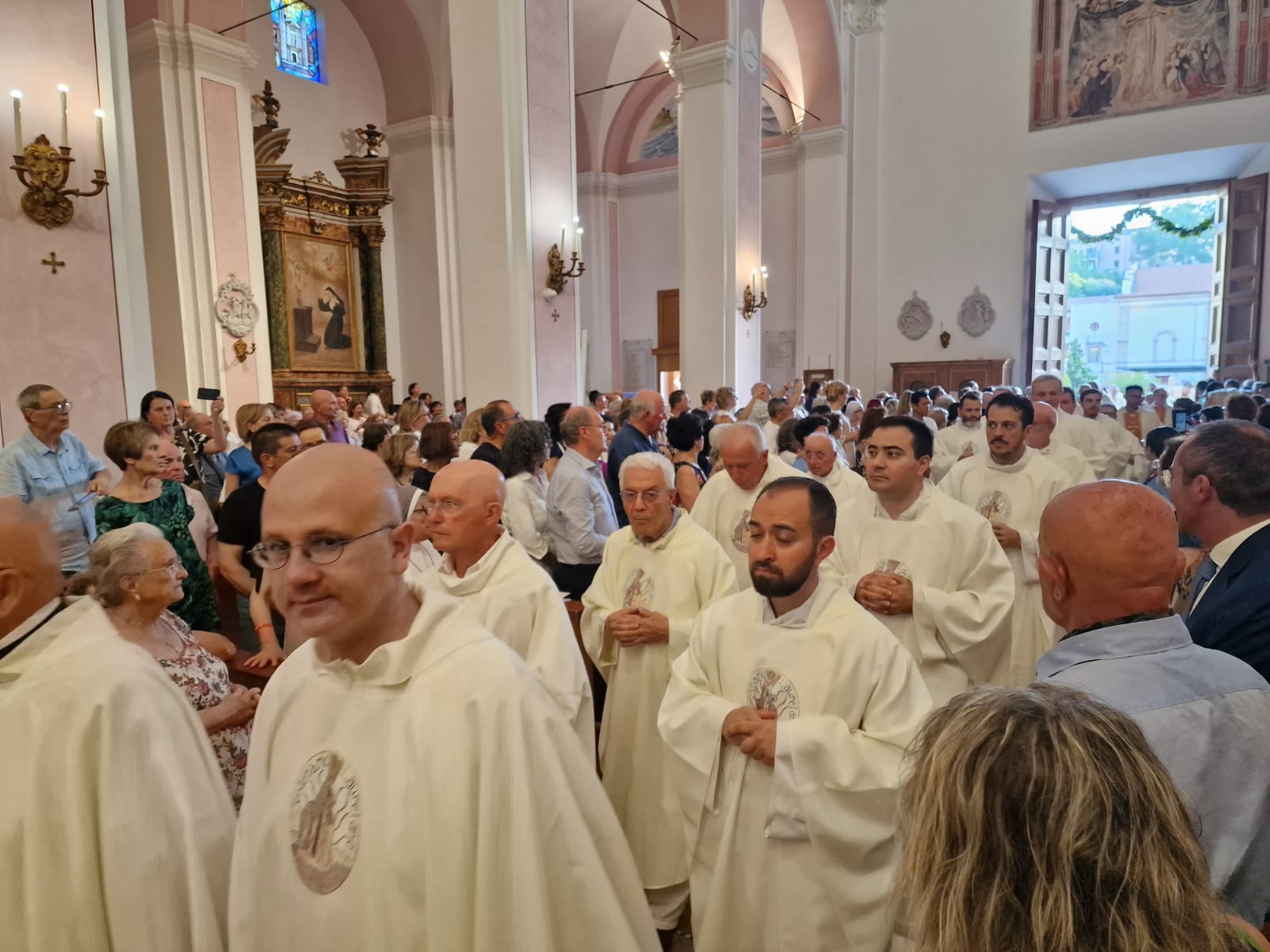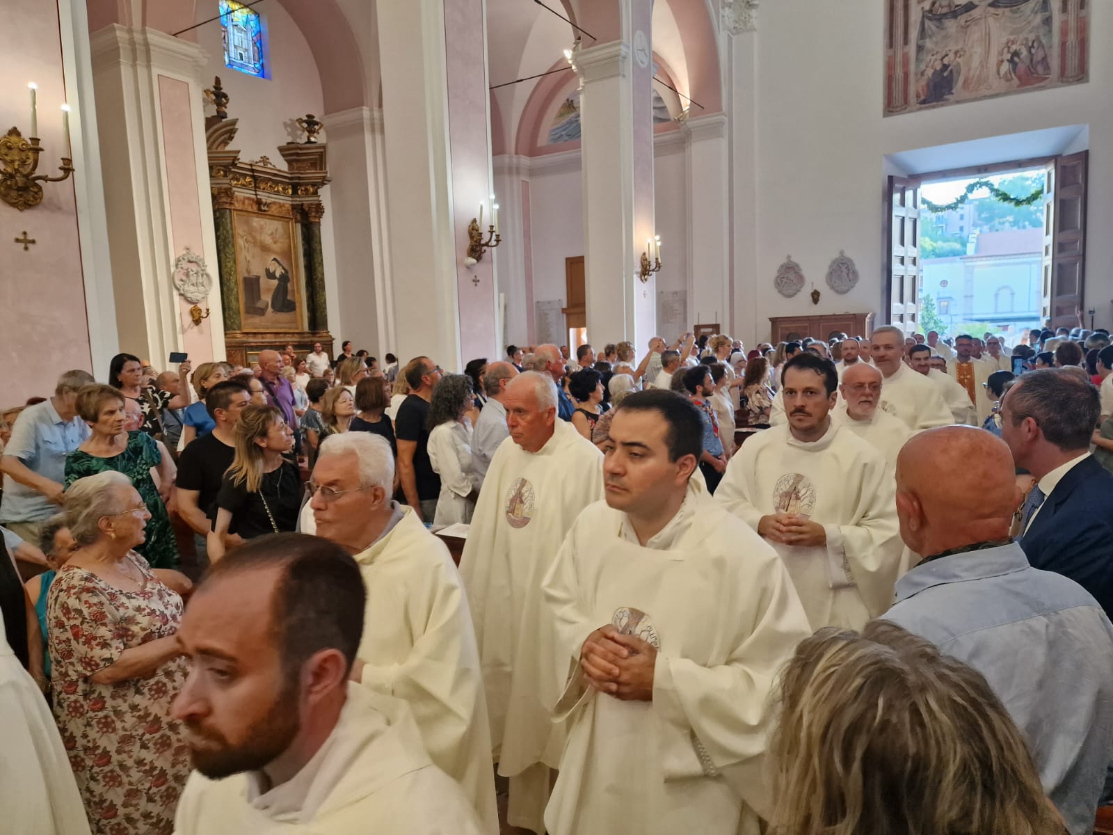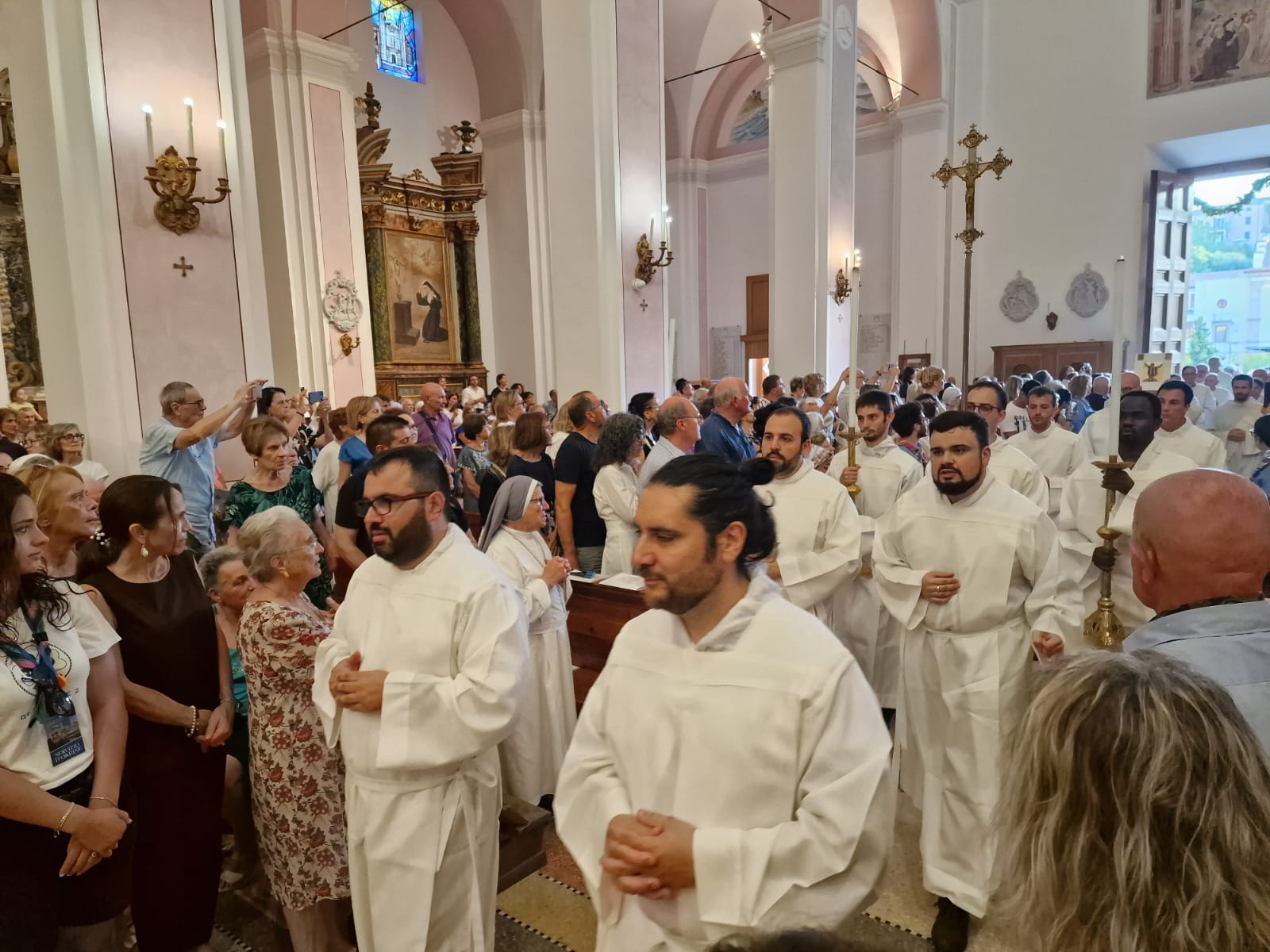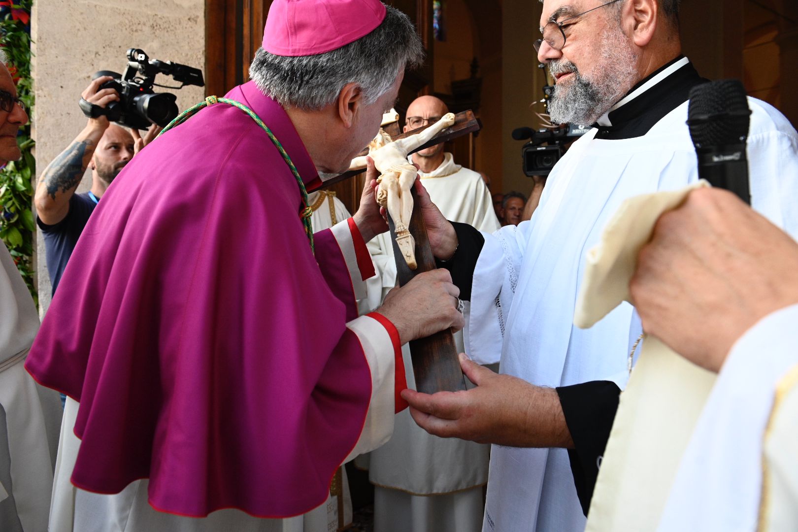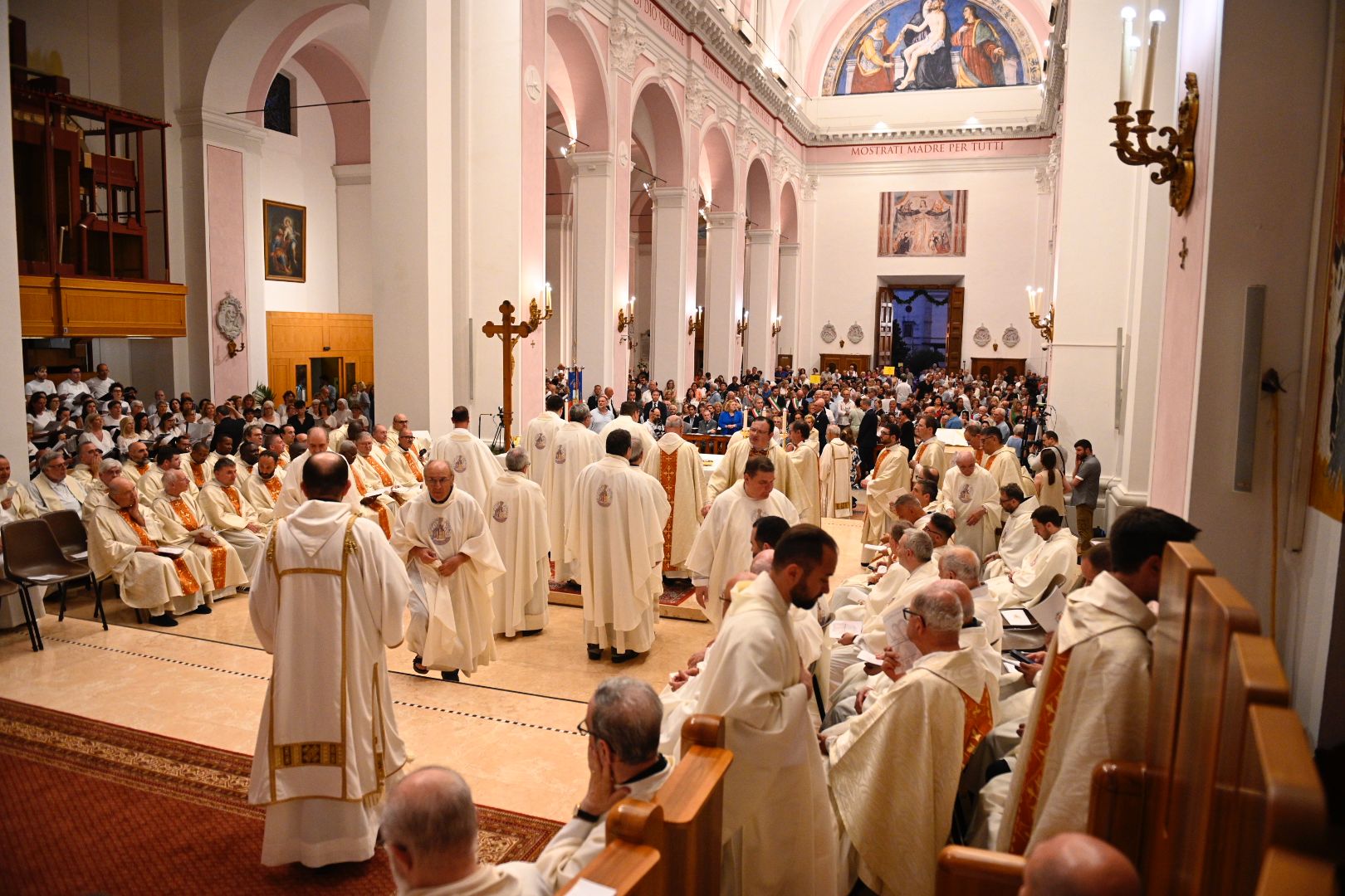 Il vescovo Palmieri ha poi compiuto proseguito il rito d’ingresso con alcuni gesti significativi: il bacio al Crocifisso, l’aspersione dei fedeli con l’acqua santa e un momento di adorazione davanti al tabernacolo. Mons. Gianpiero ha poi indossato i paramenti liturgici e ha portato processionalmente le insegne proprie del suo ministero, ricordando che egli, come il Signore Gesù, viene in mezzo alla sua gente per servire (la stola, che richiama il gesto dell’ultima cena), per insegnare e collaborare con ciascun credente a costruire il Regno (la croce pettorale, che richiama il kerigma fondamentale), per vivere pienamente la relazione con la Chiesa (l’anello, che richiama l’amore sponsale e fedele), per invitare tutti alla santità di vita (la mitria, che richiama il fulgore di una vita spirituale autentica) e per condurre tutti all’incontro con Dio (il pastorale, che richiama il bastone dei patriarchi e dei profeti, nell’unica storia della salvezza, di cui anche noi siamo parte).